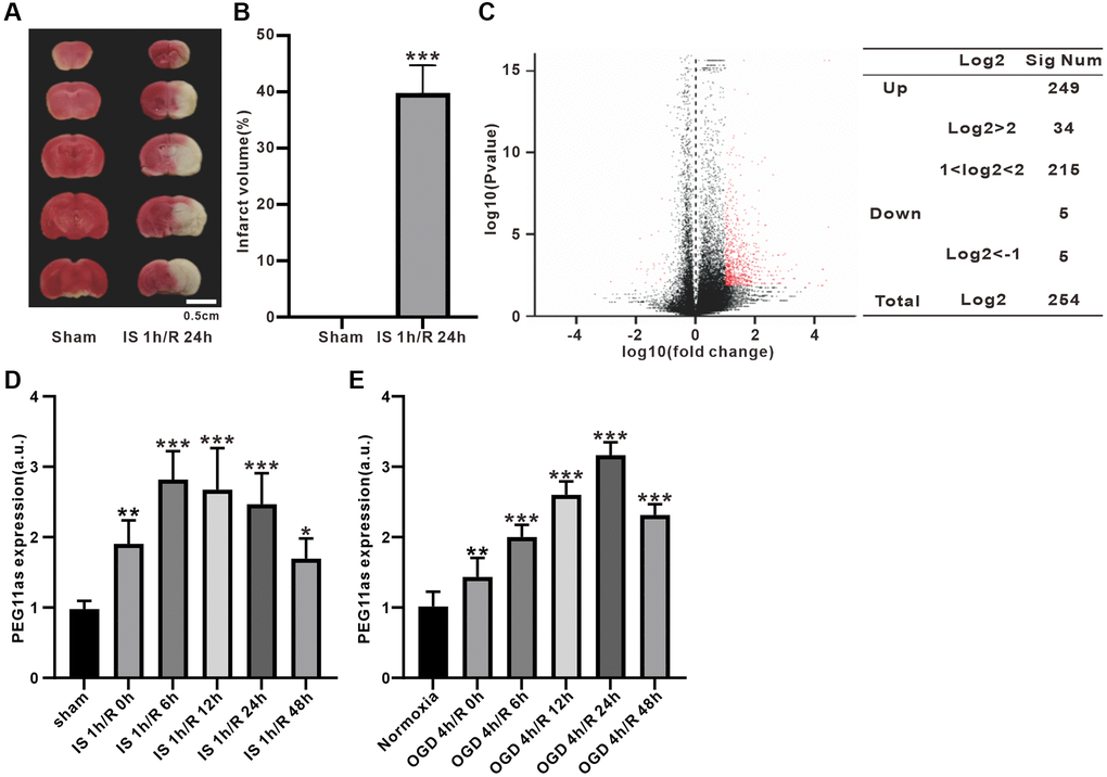 A microarray of lncRNA expression was performed in a tMCAO/R mouse model. Compared to sham group, infarct volume increased significantly in IS/R group (Figure 1A, 1B). The lncRNA expression profile showed that 254 lncRNAs (254 up-regulated/5 down-regulated) were significantly different in the ischemic penumbra expressed after tMCAO/R treatment (|log2(Fold change) |>1, adjusted P < 0.05) (Figure 1C). Of these, PEG11as expression was significantly up-regulated, as verified by RT-PCR in tMCAO/R mice and OGD/R-treated N2a cells (Figure 1D, 1E) (Supplementary Table 2).