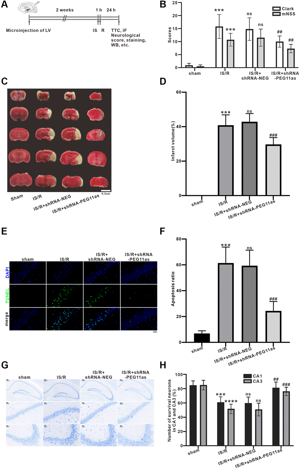 To determine the role of PEG11as in cerebral IS/R insult, a PEG11as siRNA lentivirus (shRNA-PEG11as) and its negative (shRNA-NEG) were constructed. After 2 weeks of intracerebroventricular injection of shRNA-PEG11as or shRNA-NEG, mice were subjected to MCAO for 1 hour followed by 24 hours of reperfusion (Figure 2A). According to the mNSS results, the IS/R group had obvious neurological deficits compared with the sham group, which was significantly alleviated by injection of shRNA-PEG11as (Figure 2B). Clark score results also presented similar results (Figure 2B). Meanwhile, significant cerebral infarction was found in IS/R group than that in sham group, while PEG11as silencing reduced infarct volume compared to IS/R+shRNA-NEG group (Figure 2C, 2D). In addition, TUNEL analysis found that the number of TUNEL-positive cells in IS/R group was significantly higher than that in sham group, while the number of positive cells was significantly reduced after shRNA-PEG11as injection (Figure 2E, 2F). Similar protective effects were found in the results of Nissl staining. Treatment of shRNA-PEG11as obviously reduced the number of Nissl bodies compared with the shRNA-NEG+IS/R group (Figure 2G, 2H). The above data revealed that PEG11as silencing inhibited cerebral IS/R-induced neuronal damage.