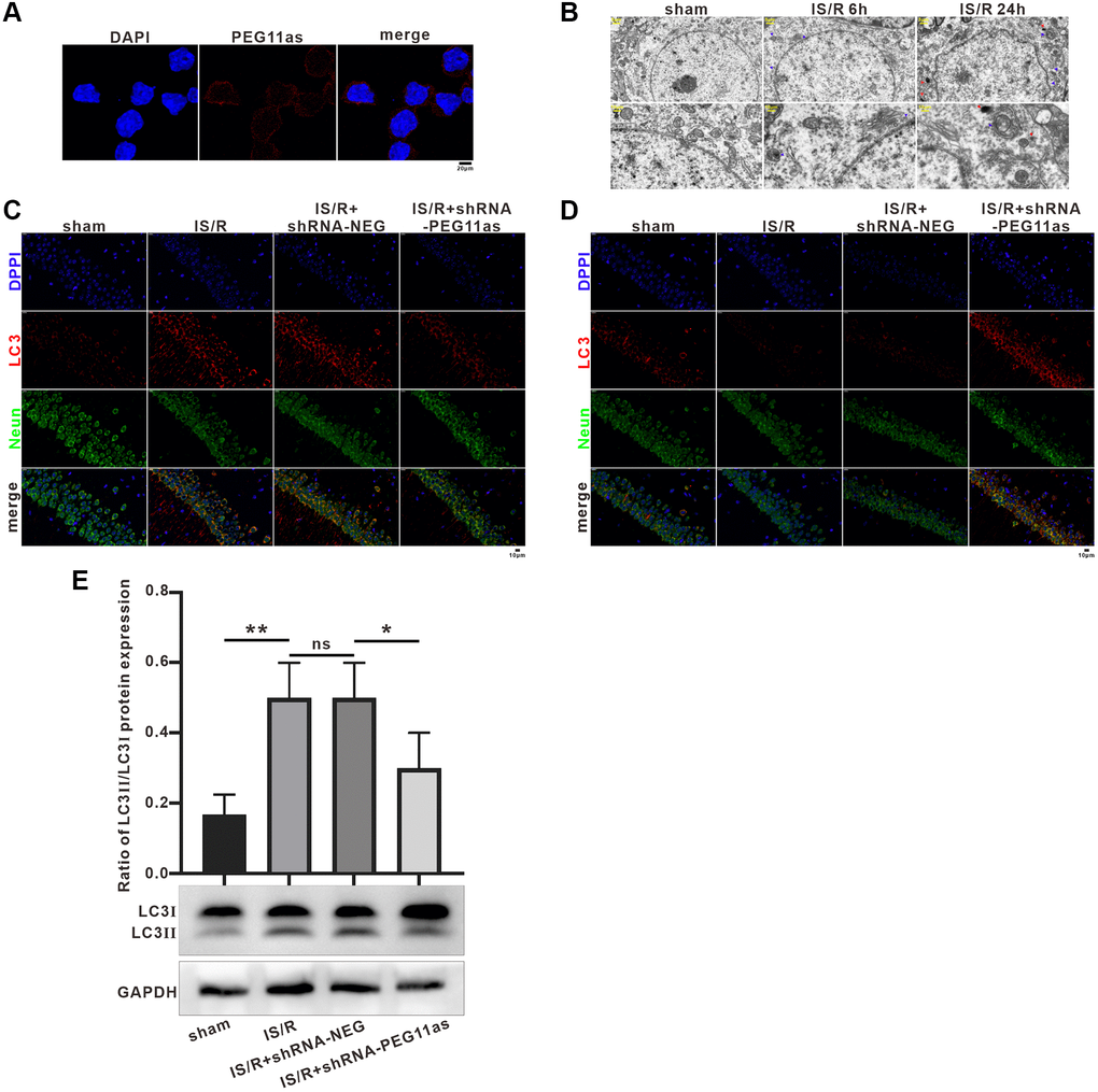 Given the critical role of PEG11as in stroke in vivo, we next wanted to explore its role in this process. We first detected PEG11as expression in N2a cells using fluorescence in situ hybridization (FISH). The results showed that PEG11as was mainly expressed in the cytoplasm (Figure 3A), suggesting that PEG11as may compete with endogenous RNA by binding to miRNA through complementary base pairing. Kyoto encyclopedia of genes and genomes (KEGG) was used to speculate PEG11as potential functions via the candidate miRNA-mRNA (http://www.genome.jp/) (Supplementary Figure 1). Target gene-enriched KEGG classes including ‘autophagy’ and ‘mTOR signaling pathway’ have been involved in ischemia stroke [25]. These results predicted the biological process of autophagy might be involved in the function of PEG11as on cerebral IS/R.
