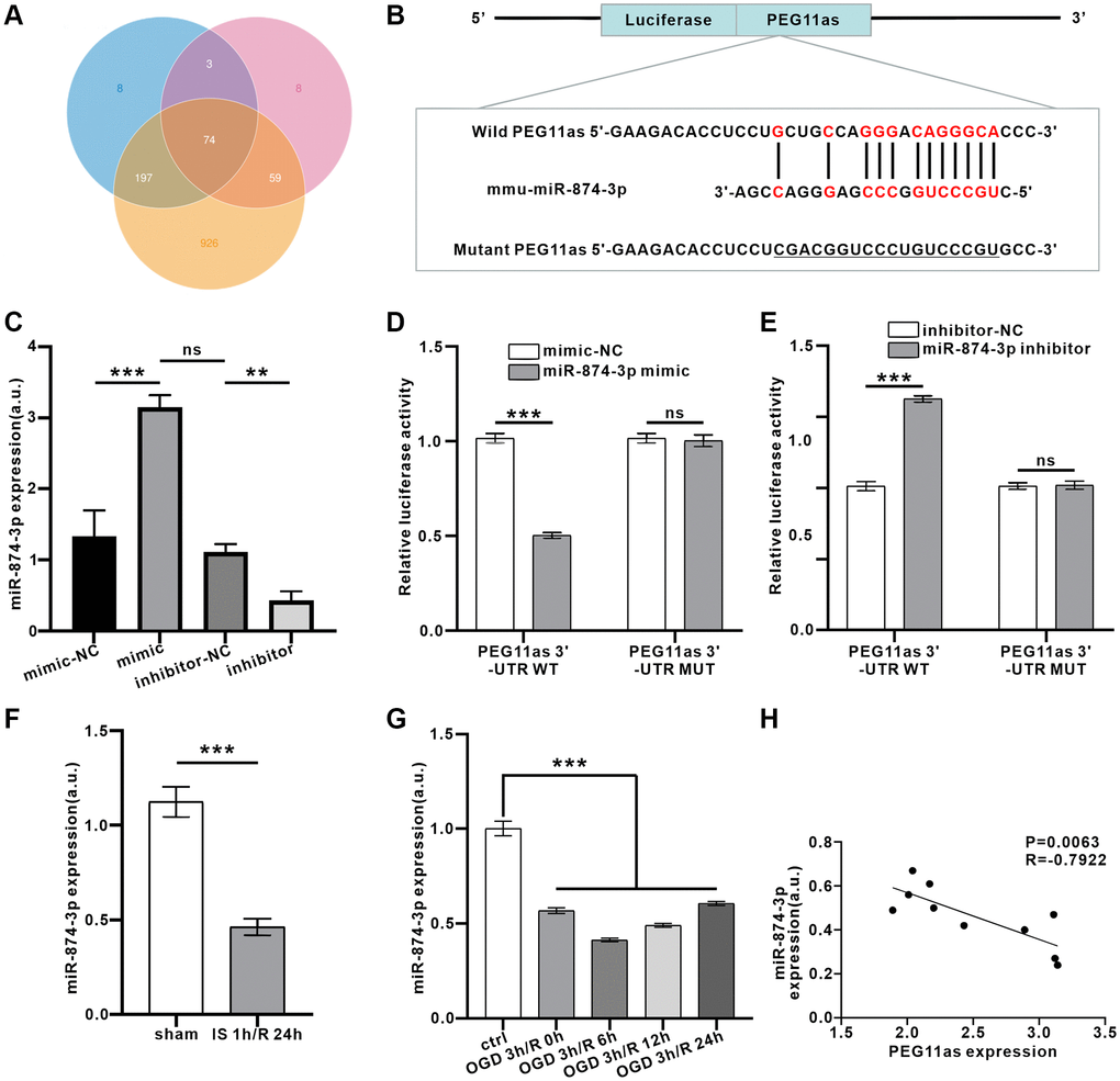 Based on in vivo studies showing that PEG11as is involved in autophagy activation, the next step is to clarify its molecular mechanism. LncRNAs affect target protein expression when endogenous RNA sponges interact with miRNAs [21]. We analyzed candidate miRNAs interacted with PEG11as by the software of miRanda, PITA and RNAhybrid. The intersection results of lncRNA-miRNA interaction in the three software were shown in Venn diagram. As shown in Figure 4A, a total of 74 miRNAs were predicted. Among them, miR-874-3p exhibited high scores, speculating that PEG11as competed with miR-874-3p as a ceRNA. Bioinformatic analysis was used to predict the binding site between PEG11as and miR-874-3p (Figure 4B). To examine the ability of PEG11as to bind to miR-874-3p, mimics and inhibitors of miR-874-3p were constructed. 48 h after transfection of these sequences, miR-874-3p was successfully overexpressed or knocked down (Figure 4C). Further, upregulation of miR-874-3p expression reduces luciferase activity in PEG11as-WT but not PEG11as-MUT (Figure 4D). Conversely, silencing miR-874-3p increased luciferase activity in PEG11as-WT, but had no significant effect on luciferase activity in PEG11as-MUT (Figure 4E), implying that miR-874-3p bound to PEG11as at the forecasted binding site. Furthermore, treatment with IS 1 h/R 24 h in vivo (Figure 4F) or with OGD 4 h/R 24 h in vitro (Figure 4G) abolished compared to control group miR-874-3p expression, indicating the opposite pattern of PEG11as expression (Figure 4H).