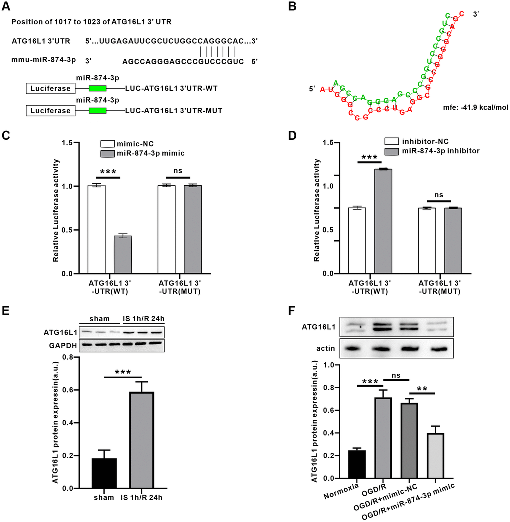 The target genes of miR-874-3p were predicted using Targetscan. Interestingly, we found a complementary pairing area between the sequences of miR-874-3p and ATG16L1 in the 3′UTR of Mus musculus (mmu) (Figure 5A). Further, 3′-UTR mixed energy analysis showed that the free energy between miR-874-3p and ATG16L1 was lower (−41.9 kcal/mol) using Bibiserv2 software, suggesting that the two may have strong binding ability (Figure 5B). Luciferase reporter gene analysis revealed that miR-874-3p directly targeted ATG16L1 through a putative binding site (Figure 5C, 5D, P < 0.01). In addition, the expression of ATG16L1 in IS 1 h/R 24 h or OGD 4 h/R 24 h groups was significantly higher than that in sham or control groups. Furthermore, transduction of miR-874-3p mimic reduced ATG16L1 expression compared with the mimic-NC group (Figure 5E, 5F).