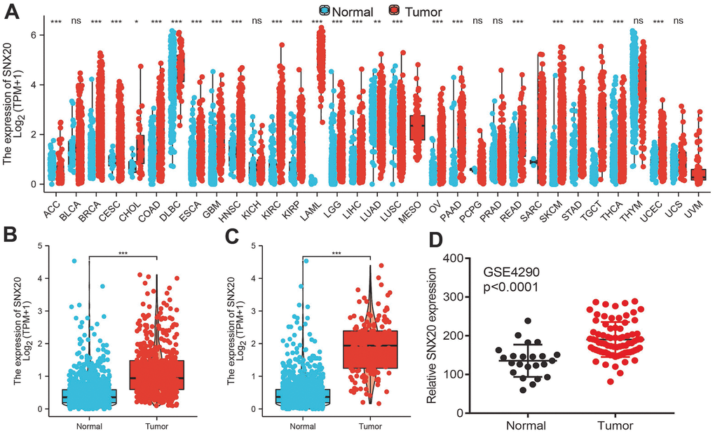 We used the TCGA and the Genotype-Tissue Expression (GTEx) databases to explore the expression of SNX20 in various cancers, Results showed that SNX20 differentially expressed in various human cancers (Figure 1A). Furthermore, we determined that SNX20 was increased in glioma tissue compared to the control group based on TCGA and GEO datasets (Figure 1B–1D). Results show that SNX20 was overexpressed in LGG tissue compared to controls.
