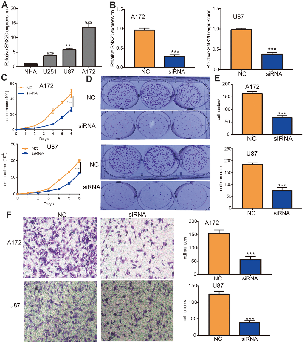 First, we found that SNX20 was elevated in GBM cell lines, especially A172 cells (Figure 10A). The qRT-PCR assay showed that SNX20 mRNA was reduced in U87 and A172 cells after treatment with targeted siRNA (Figure 10B). Second, we confirmed that SNX20 depletion significantly inhibits the proliferative ability of GBM cells (Figure 10C–10E). Furthermore, we discovered that SNX20 suppression reduced the migration ability of GBM cells examined by the Transwell assay (Figure 10F).