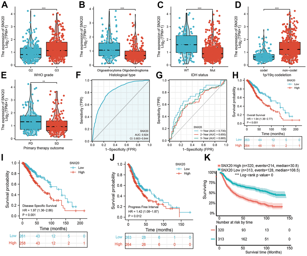 SNX20, as a member of Sorting nexins proteins family, and plays an indispensable role in protein sorting and transport [2]. Increased expression of SNX20 has been shown to predict clinical therapy response to PD-1inhibitors of NSCLC [3]. Furthermore, elevated expression of SNX20 promotes the redistribution of PSGL-1 from the cell surface to endosomal organelles [4]. Our previous study found that SNX20 decreased in non-small cell lung cancers (NSCLC). Overexpression of SNX20 prominently inhibits NSCLC cell proliferation and migration abilities. Above results show that SNX20 functions as a tumor suppressor in non-small cell lung cancer. However, it remains unclear the biological function and immune infiltration role of SNX20 in glioma progression.