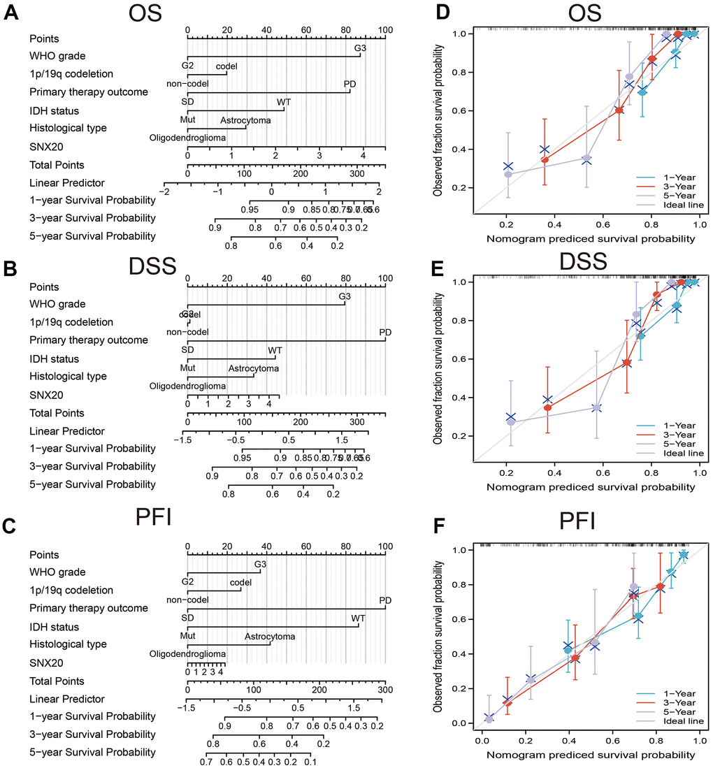 We show that increased SNX20 expression was associated with adverse clinical characteristics (Figure 3A–3E). ROC curve results confirmed that AUC values of SNX20 were 0.824 in the TCGA-LGG dataset (Figure 3F). A time-dependent ROC curve was utilized to evaluate the predictive efficiency of SNX20 in predicting 1-, 3-, and 5-year overall survival, and the AUC value of the overall survival rate of patients with glioma was 0.730, 0.650, and 0.665, respectively (Figure 3G). We also found that up-regulation of SNX20 was associated with adverse clinical outcomes, including adverse OS, DSS, and PFS (Figure 3H–3J). This result was verified by the CGGA data set (Figure 3K). We used the SNX20 expression build a nomogram and used to predict overall survival, disease-specific survival, and the progression-free interval and to calculate the respective C-indexes 0.798(0.771–0.825), 0.811(0.785–0.837), and 0.767(0.745–0.789) (Figure 4A–4F).