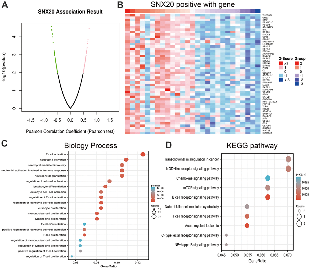 To examine the biological functions of SNX20, using linkedomics tools, we obtained co-expressed genes that were positively related to SNX20 (Figure 5A, 5B). Furthermore, functional annotation showed that SNX20 was involved primarily in T cell proliferation, regulation of leukocyte cell–cell adhesion, and regulation of T cell proliferation, and T cell differentiation among the Gene Ontology (GO) annotation terms (Figure 5C). SNX20 participates mainly in the acute myeloid leukemia, NOD-like receptor signaling pathway, the mTOR signaling pathway (Figure 5D).