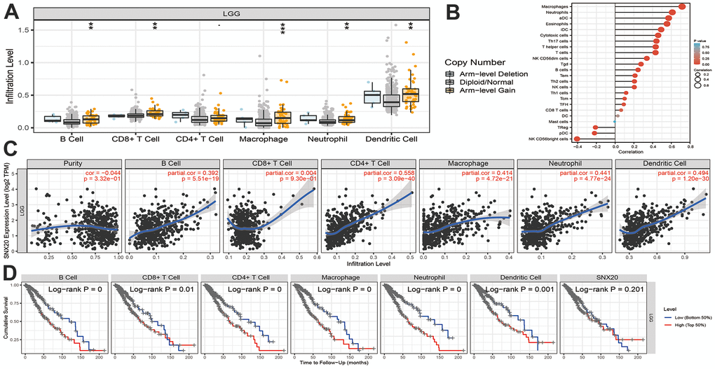 Previous reports have suggested that SNX20 expression is strongly correlated with immune infiltration levels in lung adenocarcinoma [3]. In our study, we found that SNX20 was positively related to the level of B cells, CD8+ T cells, and CD4+ T cells. Our analysis using the Cox proportional hazard model demonstrated that SNX20 were significantly was related to poor overall survival in LGG patients. We determined that increased expression of SNX20 was positively related to the abundance of 20 immune cells.
