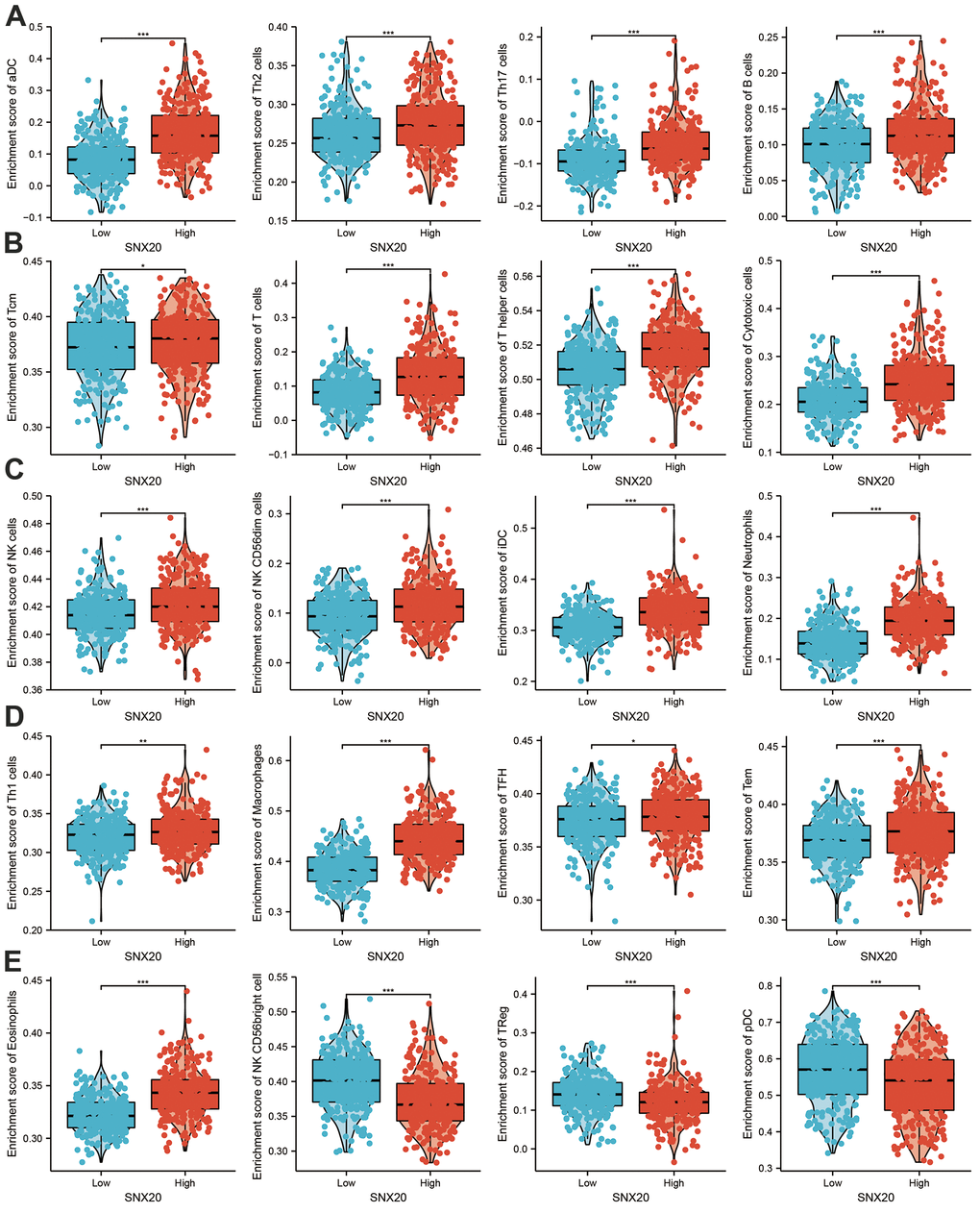 Previous studies reported that SNX20 is necessary for the classification and trafficking of intracellular proteins [4]. In our finding, we showed that SNX20 was involved primarily in T cell proliferation, regulation of leukocyte cell–cell adhesion, and regulation of T cell proliferation, and T cell differentiation. GSEA enrichment and found that higher expression of SNX20 was major participated in the JAK/STAT signaling pathway, cytotoxicity mediated by natural killer cells, cytokine receptor interactions, the transendothelial migration of leukocytes, the chemokine signaling pathway and in focal adhesion.