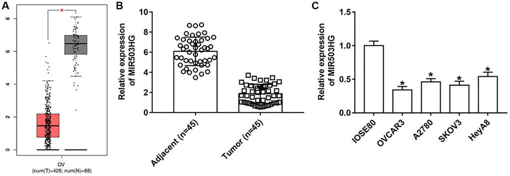 GEPIA online database was used to analyze the expression of MIR503HG in ovarian cancer tissues and adjacent normal tissues, and lower expressed MIR503HG was observed in ovarian tumor tissues than in non-cancerous tissues (Figure 1A). Moreover, RT-qPCR results confirmed that MIR503HG expression was downregulated in collected ovarian cancer tissues and cell lines (OVCAR3, A2780, SKOV3, and HeyA8), compared with that in adjacent normal tissues and normal human ovarian epithelial cells (IOSE80) (Figure 1B, 1C).
