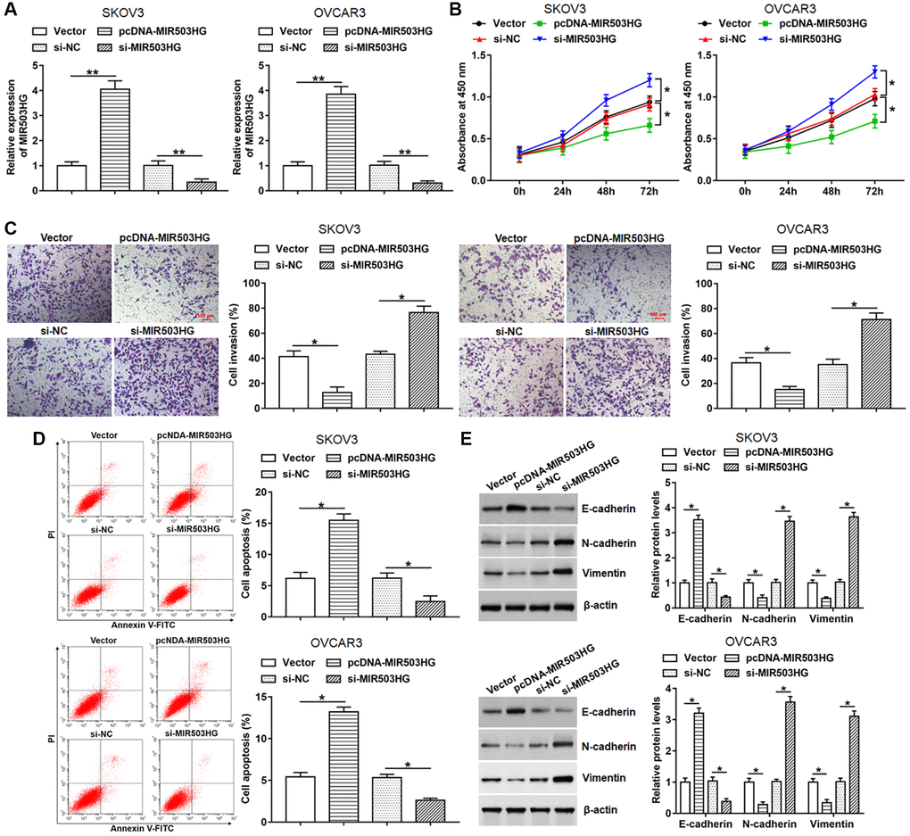 Next, pcDNA-MIR503HG, MIR503HG siRNA or respective controls were transfected into SKOV3 and OVCAR3 cells to evaluate the effect of MIR503HG on cell behaviors. Upregulated expression of MIR503HG was detected after transfection with pcDNA-MIR503HG, and reduced expression of MIR503HG was observed after interference with MIR503HG (Figure 2A). Moreover, our data displayed that overexpression of MIR503HG markedly suppressed cell proliferation and invasion, and facilitated cell apoptosis, while MIR503HG silence played an adverse role (Figure 2B–2D). Furthermore, we found that enforced expression of MIR503HG notably increased the expression of E-cadherin and reduced the expression of N-cadherin and Vimentin, and MIR503HG knockdown showed an opposite effect (Figure 2E).