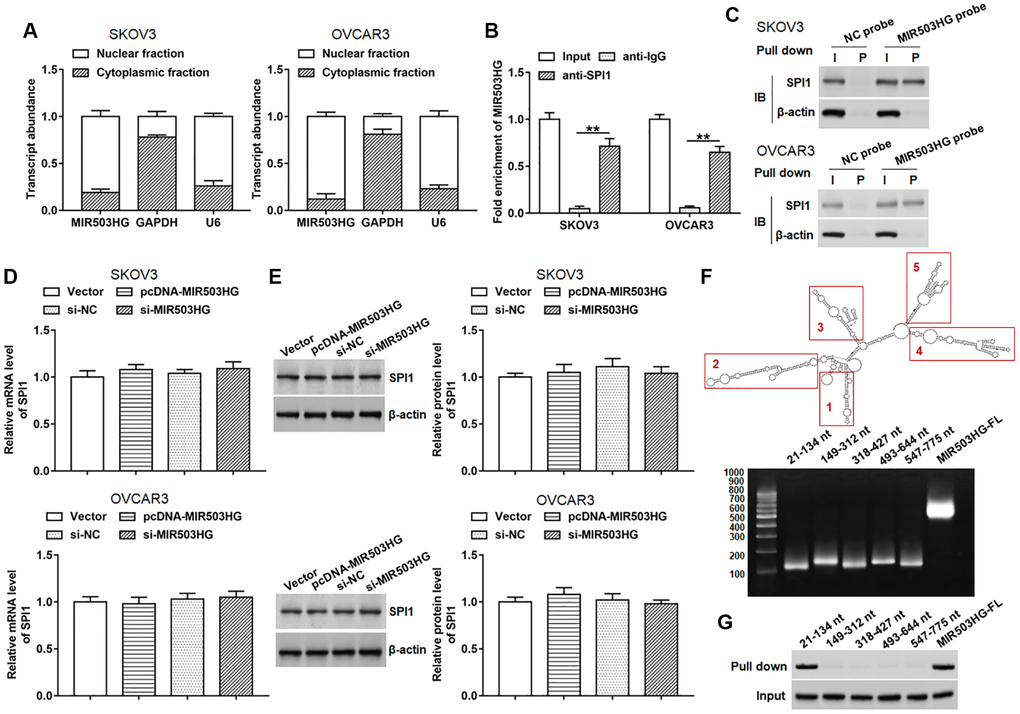 Since the subcellular localization of lncRNA is closely related to its function, we first performed nucleo-cytoplasmic separation test and found that MIR503HG was mainly located in the nucleus in SKOV3 and OVCAR3 cells (Figure 3A). lncMAP (http://bio-bigdata.hrbmu.edu.cn/LncMAP/) was applied to predict potential MIR503HG binding transcription factors. Among these transcription factors, we noticed that SPI1 was reported to promote malignant progression of ovarian cancer. Whereafter, RIP and RNA pull-down assays were performed to verify the binding of MIR503HG and SPI1. The results of RIP showed that MIR503HG was prominently enriched in immunocomplex precipitated by anti-SPI1, compared with that in immunocomplex precipitated by anti-IgG (Figure 3B). Moreover, compared with using NC probe, SPI1 protein was significantly enriched in RNA-protein immune complexes pulled down by using MIR503HG probe (Figure 3C). We also explored the regulatory effect of MIR503HG on the expression of SPI1 and found that neither overexpression nor interference with MIR503HG did not alter the mRNA and protein expression levels of SPI1 (Figure 3D, 3E). Furthermore, we divided MIR503HG sequence into five truncated parts according to the stem-loop structure of MIR503HG to explore the binding region of SPI1 on the MIR503HG sequence. The RNA pull-down assay revealed that SPI1 mainly bound to MIR503HG fragment 21-134 nt (Figure 3F, 3G).