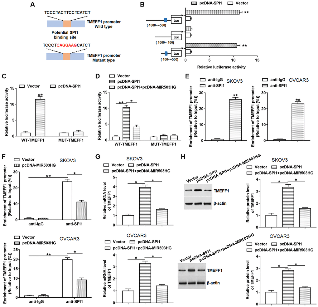 By using the ChIPBase database, we found that SPI1 might bind to the promoter region of TMEFF1, and the binding motif is “TCCCTACTTCCTCATCT” (Figure 4A). Next, we constructed three truncated vectors of the TMEFF1 promoter part to explore the binding region of SPI1. The results showed that the luciferase activities of the reporters containing the predicted binding site and full-length sequence were markedly upregulated after overexpression of SPI1. While SPI1 overexpression did not change the luciferase activity of the reporter without predicted binding site (Figure 4B). Moreover, we constructed two luciferase reporters consisting of wild-type (WT) and mutant-type (MUT) TMEFF1 promoters, and observed that overexpression of SPI1 significantly promoted the luciferase activities of the WT-TMEFF1 reporter without affecting the luciferase activities of the MUT-TMEFF1 reporter (Figure 4C). Whereas overexpression of MIR503HG notably suppressed the promotion effect of SPI1 on the luciferase activities of the WT-TMEFF1 reporter, but did not change the luciferase activities of the MUT-TMEFF1 reporter (Figure 4D). Moreover, ChIP assay was carried out to verify the binding of SPI1 to the TMEFF1 promoter region. The data displayed that TMEFF1 promoter was markedly enriched in the SPI1 antibody-precipitated complex, and transfection with pcNDA-MIR503HG significantly suppressed the binding of SPI1 to the TMEFF1 promoter region (Figure 4E, 4F). Furthermore, overexpression of SPI1 increased the mRNA and protein levels of TMEFF1 in SKOV3 and OVCAR3 cells, which was reversed by transfection with pcNDA-MIR503HG (Figure 4G, 4H).