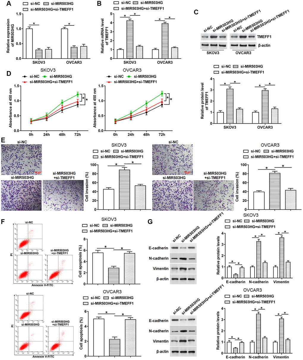 To explore whether MIR503HG affected cell behaviors by regulating TMEFF1 expression, SKOV3 and OVCAR3 cells were transfected with MIR503HG siRNA alone or together with TMEFF1 siRNA. The results of RT-qPCR and Western blotting assays indicated that transfection with MIR503HG siRNA notably inhibited MIR503HG expression and upregulated TMEFF1 mRNA and protein levels. And compared with MIR503HG siRNA treatment group, the co-transfection of MIR503HG siRNA and TMEFF1 siRNA suppressed the mRNA and protein expression of TMEFF1 without altering the expression of MIR503HG (Figure 5A–5C). Moreover, TMEFF1 knockdown reversed the upregulation of cell proliferation and invasion, and the decrease of cell apoptosis caused by interference with MIR503HG (Figure 5D–5F). Additionally, MIR503HG knockdown observably inhibited E-cadherin expression and increased N-cadherin and Vimentin expression, which was suppressed by silencing TMEFF1 (Figure 5G).