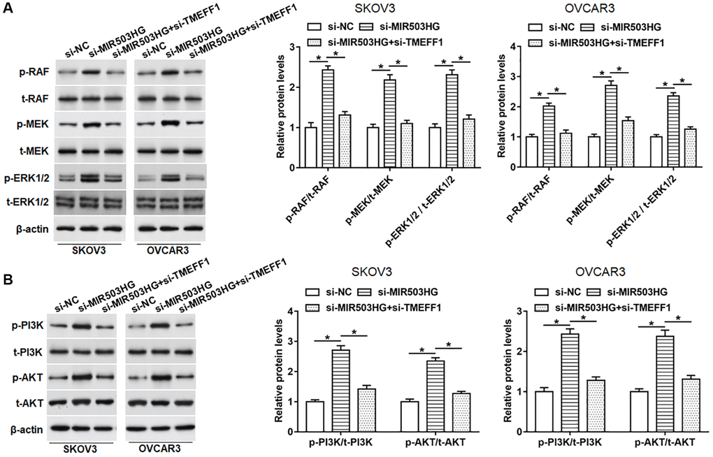 It is reported that TMEFF1 can promote the malignant behaviors of ovarian cancer cells by activating the MAPK and PI3K/AKT pathways. In order to explore whether MIR503HG affected the activities of MAPK and PI3K/AKT pathways through regulating TMEFF1, SKOV3 and OVCAR3 cells were transfected with MIR503HG siRNA alone or together with TMEFF1 siRNA. Our data revealed that the knockdown of MIR503HG obviously upregulated the protein levels of phosphorylated-RAF (p-RAF), p-MEK, p-ERK1/2, as well as p-PI3K and p-AKT, which was reversed by the science of TMEFF1 (Figure 6A, 6B). While the expression of total-Raf (t-Raf), t-MEK, t-ERK1/2, as well as t-PI3K and t-AKT did not change whether interference with MIR503HG or co-interference with MIR503HG and TMEFF1 (Figure 6A, 6B).
