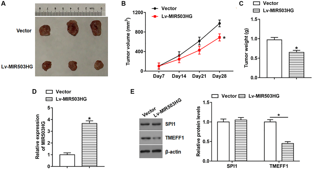 To explore the effect of MIR503HG on tumorigenesis, SKOV3 cells infected with lentiviral empty vector or Lv-MIR503HG were subcutaneously injected into the right flank of each nude mouse, and the tumor volume and weight were measured. The results revealed that overexpression of MIR503HG prominently hindered tumor growth (Figure 7A–7C). And the expression of MIR503HG was significantly upregulated and TMEFF1 protein level was observably declined in tumor tissues after MIR503HG overexpression (Figure 7D, 7E). While overexpression of MIR503HG in tumor tissues did not alter the protein level of SPI1 (Figure 7E).
