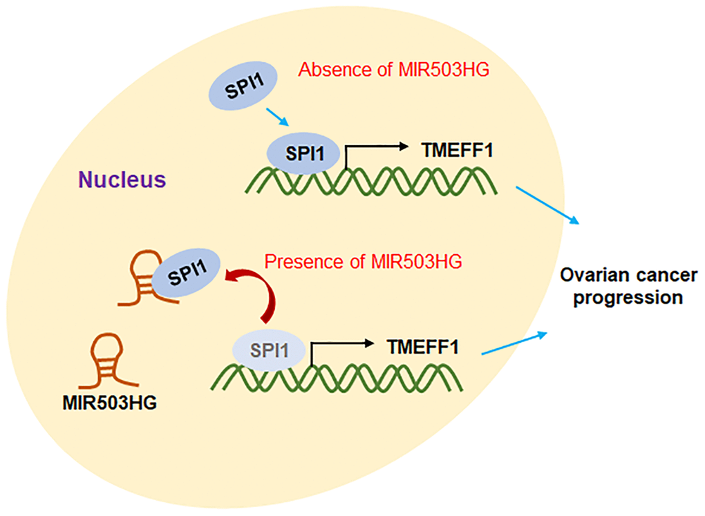 As shown in Figure 8, MIR503HG inhibited SPI1-mediated transcriptional activation of TMEFF1 by binding to SPI1, and suppressed the expression of TMEFF1, thus hindering the progression of ovarian cancer.