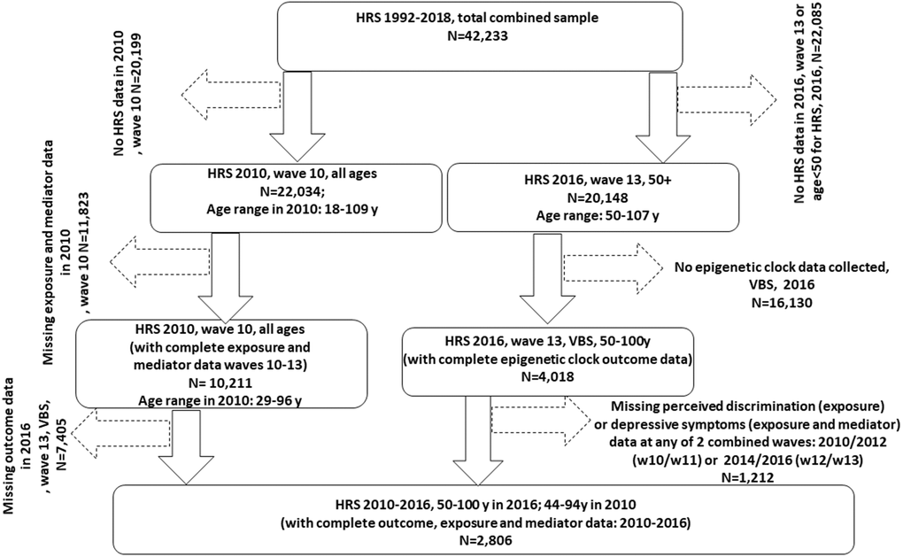 Our sample was restricted to HRS participants for whom data were collected during 2008, 2012 and 2016. The latest wave (2016) collected data on 4,108 participants by estimating 13 epigenetic clocks from DNAm and other biomarker data (Figure 1). We linked the latest release of 2016 epigenetic clock data with 2008 through 2016 EFTF respondent data using the 1992–2018 HRS longitudinal file developed by the RAND Center for the Study of Aging. Imputed data was used when possible, including household income data. Of 4,018 participants with complete QCed epigenetic clock data, 2,806 had complete 2010–2012 and 2014–2016 combined exposure and mediator (perceived discrimination scores and CES-D total score) data. This was the final sample size since all other covariates were imputed (<5% missing individually).