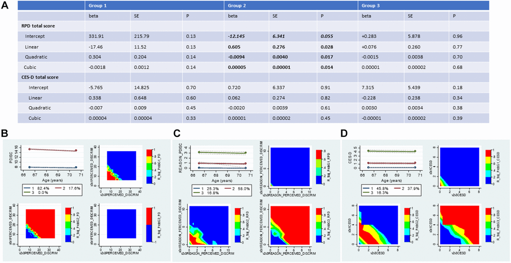 A Stata plugin (traj and trajplot) adapted from a well-established SAS procedure [44] was used to perform group-based trajectory modeling, GBTM – a specialized form of finite mixture modeling – to identify groups of older adults with similar developmental trajectories over time. This group-based approach utilizes a multinomial modeling strategy and maximum likelihood to estimate model parameters, with maximization achieved by the quasi-Newton procedure. We specified a zero-inflated Poisson (zip) for the selected outcomes, with intercept (0), linear (1), quadratic (2) and cubic (3) orders for each group trajectory and displayed group-based trajectories over time with 95% confidence intervals (CI). For consistency and ease of interpretation, we defined up to three groups per outcome. We reported the Akaike Information Criterion (AIC) for each group-based trajectory model as a goodness-of-fit measure. This procedure was applied to three main scores, hereafter labelled as trajectory exposures: (1) Perceived discrimination score trajectory between 2010–2012 and 2014–2016; (2) Reasons for Perceived discrimination score trajectory for the same two periods; (3) CES-D total score for the same two periods. Age was used as the time variable in these models.