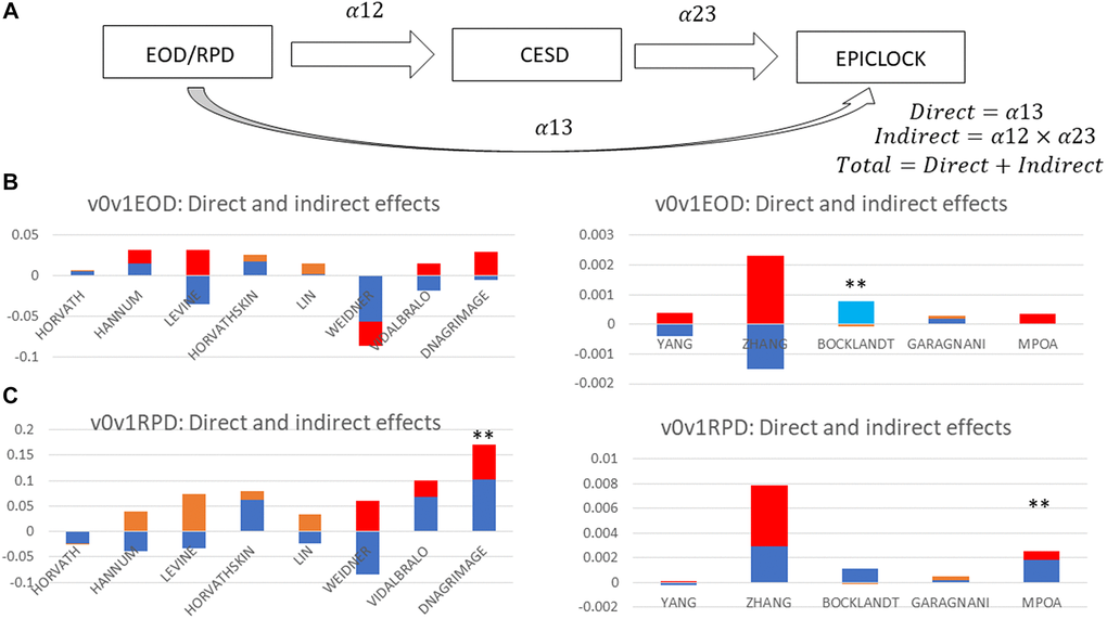 As a sensitivity analysis, a structural equations model was performed whereby the outcomes were alternatively one of each 13 epigenetic clocks, the two main exposures were EOD an RPD measured in 2010-2012, and the potential mediator was CES-D total score measured in 2014–2016. Exogenous variables included in this model were allowed to predict each of the outcome, exposure and mediator, and those were 2014–2016 age, sex, and race (Non-White vs. White). Total effects were examined for statistical significance at type I error of 0.05 and were decomposed into indirect and direct effect. Statistically significant mediation was determined when an indirect effect going in the same direction as a statistically significant total effect, had an associated p-value < 0.05. More details regarding this approach is provided in an earlier study [47]. This analysis was conducted on the first imputation of five and was compared to at least one other imputation.