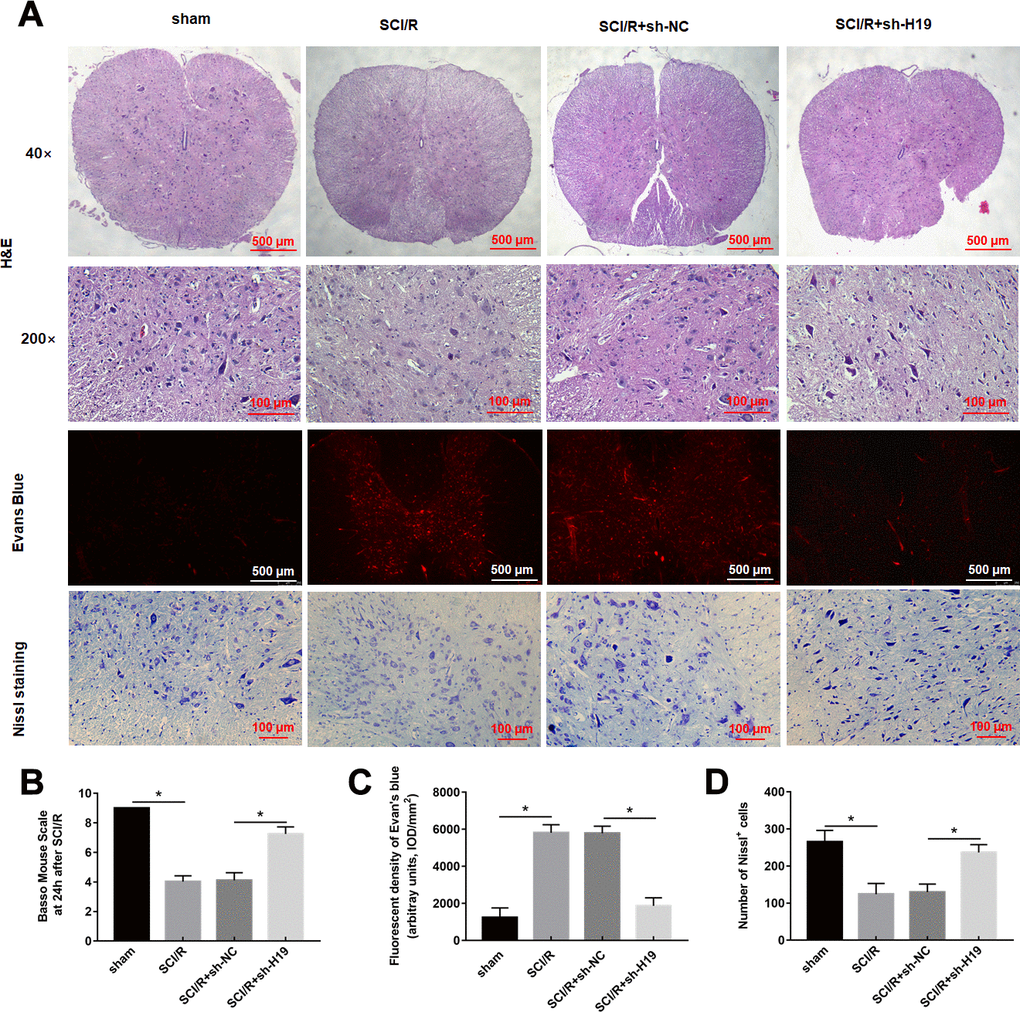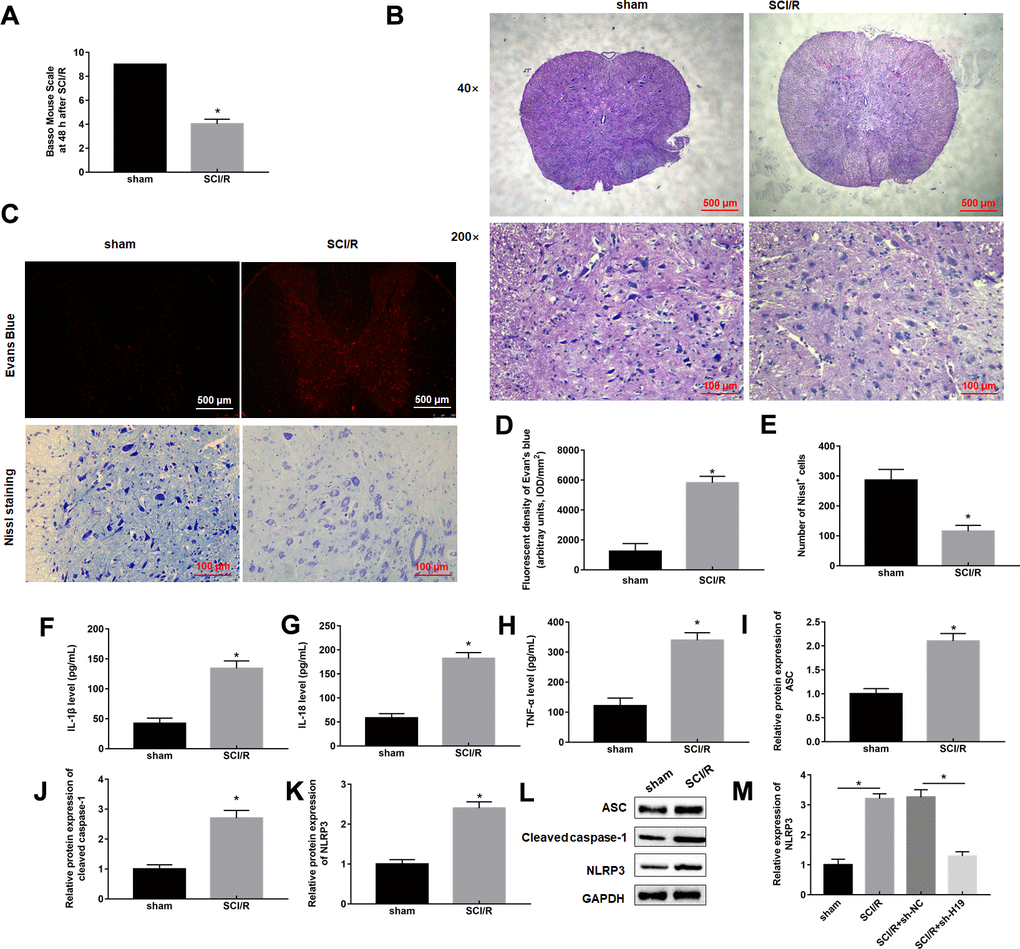 SCI/R surgery was applied to construct SCI/R injury model in vivo. We first measured the BMS scores to evaluate the motion function of mice suffering from SCI/R surgery, the results showed an effective reduction of score after 48 h reperfusion compared with sham group (Figure 1A). Our results from hematoxylin-eosin staining showed that SCI/R mice displayed the presence of shrunken nuclei and extensive vacuolar degeneration, indicating a significant loss of intact neurons (Figure 1B). As shown in Figure 1C, 1D, mice of Sham group displayed almost no EB extravasation, and SCI/R group displayed obvious EB extravasation at 48 h post-surgery. Nissl staining showed that the neuronal cell loss and morphological changes were significantly reduced in SCI/R mice (Figure 1C, 1E). Then, the levels of pyroptosis marker proteins, including IL-1β, IL-18, TNF-α, NLRP3, ASC, and caspase-1 were checked, and the results showed that they were all markedly increased in response to SCI/R surgery (Figure 1F–1L), indicating that pyroptosis occurs during SCI/R. Interestingly, we found that lncRNA H19 was robustly upregulated in spinal cord of SCI/R mice (Figure 1M).