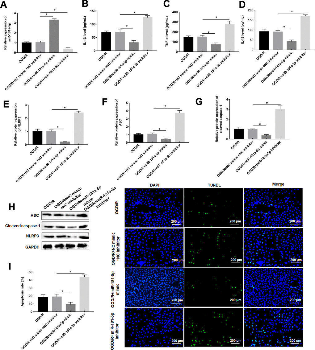 MiR-181a-5p mimic had a good promoting effect on miR-181a-5p expression, whereas miR-181a-5p inhibitor showed an inhibitory effect in OGD/R-administrated PC12 cells (Figure 4A). In response to miR-181a-5p overexpression, the increases of PC12 cell inflammation and apoptosis induced by OGD/R treatment were reversed, as reflected by suppressed of proinflammatory proteins and pyroptosis marker proteins, as well as decreased apoptosis rate (Figure 4B–4I). miR-181a-5p inhibitor further enhanced these changes in inflammation response and apoptosis resulted from OGD/R treatment (Figure 4B–4I).