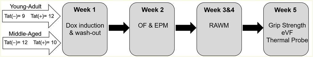 Herein, we investigate the combined effects of aging and HIV-1 Tat expression on the development of neuroHIV-like sequelae in young adult (6–8 months) and middle-aged (11–13 months) male mice to determine whether Tat precipitates age-related dysfunction. We hypothesized that conditional Tat expression in transgenic male mice [Tat(+)] would accelerate the development of (i.e., catalyze earlier presentation) or accentuate (i.e., increase magnitude) age-related affective, cognitive, neuromuscular, and neuropathic pain symptomatology compared to age-matched controls [Tat(–)] (Figure 1). We further expected that Tat would alter the production of circulating and central steroids (T, E2, P4, corticosterone, or alloP) concurrent with behavioral impairment.
