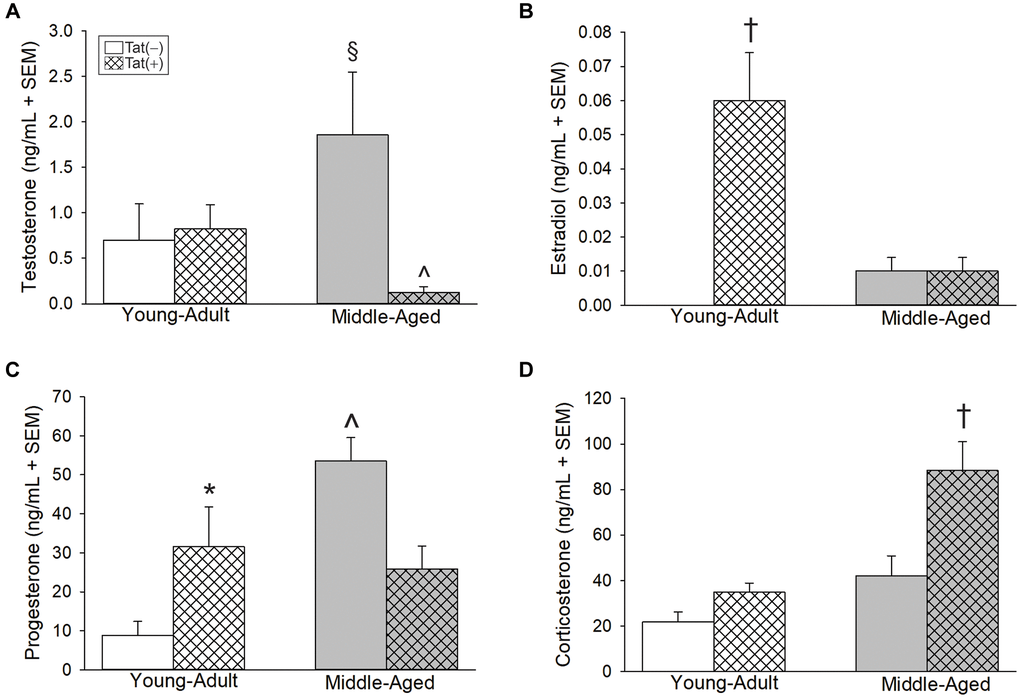 Aging and Tat expression altered circulating gonadal and adrenal steroid hormones. Older age and Tat expression interacted to influence circulating T [F(1,24) = 5.46, p < 0.05; Figure 2A]. Middle-aged Tat(−) mice exhibited greater T than did their respective young adult Tat(−) controls (p = 0.05; Figure 2A, see §) or their respective middle-aged Tat(+) counterparts (p = 0.007; Figure 2A, see ^). Among young adult mice, circulating E2 was greater in Tat(+) males compared to all other groups [F(1,23) = 34.98, p < 0.05; Figure 2B; see †]. Moreover, the calculated E2:T ratio (a measure of aromatization) was greatest in young adult Tat(+) mice compared to any other group [F(1,20) = 10.39, p < 0.05], [E2:T ratio: Tat(−)Young Adult = 0 ± 0 ng/mL, Tat(+)Young Adult = 0.06 ± 0.01 ng/mL, Tat(−)Middle-aged = 0.02 ± 0.02 ng/mL, Tat(+)Middle-aged = 0.01 ± 0.01 ng/mL]. E2 and the E2:T ratio were notably increased with middle-age; however, this did not reach statistical significance (p = 0.09, n.s.). Circulating P4 also interacted with age and Tat expression [F(1,27) = 13.16, p < 0.05; Figure 2C]. Middle-aged Tat(−) mice demonstrated the greatest circulating P4 concentrations of all groups (p < 0.0001 – 0.04; Figure 2C, see ^) and young adult Tat(+) mice demonstrated greater P4 than their age-matched Tat(−) controls (p = 0.02; Figure 2C, see *. Corticosterone was highest among middle-aged Tat(+) mice versus all other groups [F(1,23) = 4.69, p < 0.05; Figure 2D, see †].