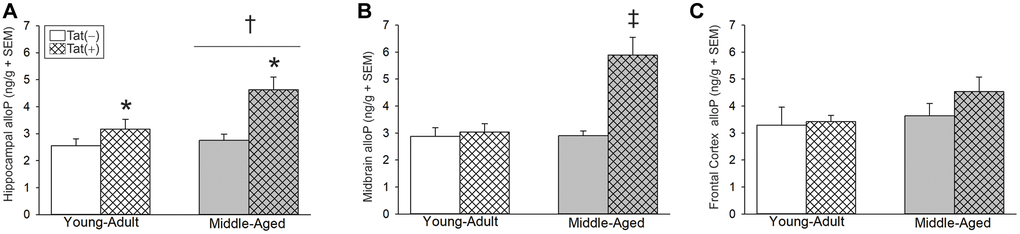 Older age and Tat expression also interacted to influence brain alloP content. We previously observed that Tat expression increased alloP protein content in the whole brain of young male mice, without changes in serum [36]. However, regional analysis of Tat-provoked alloP in the brain has not been conducted heretofore. In hippocampus, older age [F(1,22) = 6.21, p < 0.05; Figure 3A, see †] or Tat expression [F(1,22) = 14.12, p < 0.05; Figure 3A, see *] increased alloP content. In midbrain, age and Tat expression interacted to increase alloP content in middle-aged Tat(+) mice to a greater extent than that seen in all other groups [F(1,24) = 13.71, p < 0.05, Figure 3B, see ‡]. No significant differences were observed in alloP content within the frontal cortex (Figure 3C).