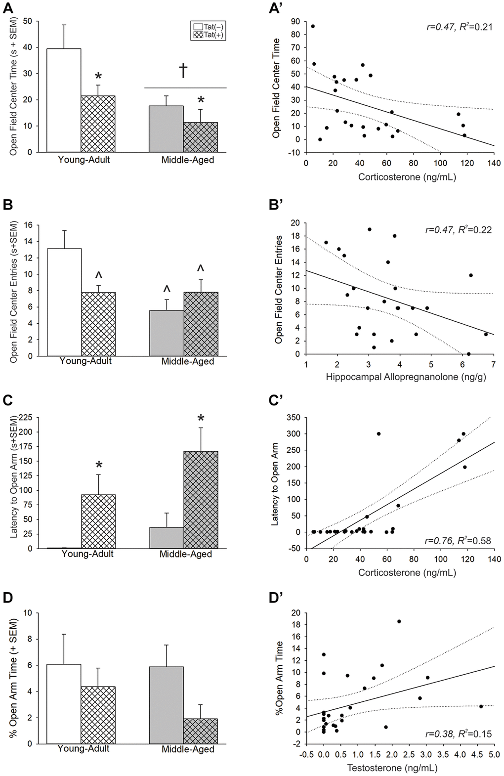 Aging and Tat expression promoted anxiety-like behavior. In the open field, there were main effects for age [F(1,35) = 9.14, p < 0.05; Figure 4A, see †] and Tat expression [F(1,35) = 5.29, p < 0.05; Figure 4A, see *], both of which increased anxiety-like behavior and reduced time spent in the center of the open field compared to young adult or Tat(−) counterparts, respectively. As well, there was an interaction wherein age or Tat genotype increased anxiety-like behavior [F(1,36) = 5.86, p < 0.05; Figure 4B]. Both middle-aged mice and Tat(+) young adult mice made fewer entries into the brightly-lit center of the open field compared to young adult Tat(−) controls (p = 0.001–0.027; Figure 4B, see ^). In the elevated plus-maze, we observed a main effect for Tat [F(1,38) = 13.13, p < 0.05; Figure 4C, see *] to increase the latency to enter the open arms compared to Tat(−) controls. As well, Tat(+) mice demonstrated a notable decrease in the proportion of open arm time compared to Tat(−) mice; albeit, this did not reach statistical significance (p = 0.09; Figure 4D). Notably, motor differences were detected for the distance (cm) [F(1,36) = 16.82, p < 0.05; Table 1] and velocity (cm/s) [F(1,36) = 16.85, p < 0.05; Table 1] traveled in the open field. Middle-aged or Tat(+) mice demonstrated motor deficits and travelled shorter distances (p = 0.0001–0.042), and at lower velocities (p < 0.0001–0.041), than did young adult Tat(−) mice. Within the middle-aged group, Tat(−) males travelled shorter distances (p = 0.03) and at slower velocities than did Tat(+) mice (p = 0.03). No differences were observed in the total arm entries made in the elevated plus-maze (Table 1).