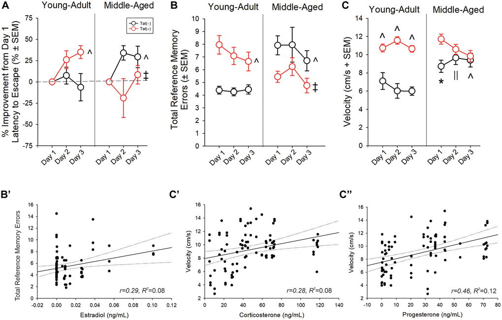 Older age and Tat expression interacted to influence latencies to escape a radial arm water maze [F(2,76) = 3.42, p < 0.05; Table 3]. Young adult, Tat(−) mice demonstrated longer latencies to escape than young adult Tat(+) mice (day 2; p = 0.004) and middle-aged groups (day 3; p < 0.001–0.005). Age and Tat expression also interacted to alter the proportional performance improvements from day 1 [F(1,35) = 9.46, p < 0.05; Figure 5A]. Unexpectedly, young adult Tat(−) mice demonstrated less improvement than did young adult Tat(+) (p = 0.022; Figure 5A; see ^) and middle-aged Tat(−) mice (p = 0.018; Figure 5A; see ^). Middle-aged Tat(+) mice demonstrated less improvement than did their age-matched, control counterparts (p = 0.004; Figure 5A; see ‡) or young adult Tat(+) mice (p = 0.006; Figure 5A; see ‡). When assessing the total errors made, age and Tat expression interacted [F(1,76) = 17.95, p < 0.05; Figure 5B]. Among young adult mice, Tat expression increased the number of errors made (p < 0.0001; Figure 5B, see ^). Older age also increased the number of errors made among Tat(−) controls, compared to their young adult counterparts (p < 0.0001; Figure 5B, see ^). Contrary to expectation, middle-aged Tat(+) mice made fewer errors than did their respective Tat(−) controls or their young adult Tat(+) counterparts (p = 0.001–0.006; Figure 5B; see ‡). This may have been related to differences in swim speed. Among the middle-aged group, Tat(+) mice swam faster than their age-matched, or young-adult, Tat(−) counterparts only on day 1 (p < 0.0001–0.002; Figure 5C, see *). Middle-aged mice were faster than their young adult controls on days 2 (p < 0.0001–0.03; Figure 5C, see ||) and 3 (p < 0.0001; Figure 5C, see ^). Fewer errors made by middle-aged Tat(+) mice may be a consequence of increased anxiety and faster latencies to escape (Table 3). In support, despite observing no difference in the distance travelled (Table 3), a significant interaction between age, Tat expression, and day of testing was observed for swim speed [F(2,78) = 5.82, p < 0.05; Figure 5C]. Among young adults, Tat(+) mice swam faster than their Tat(−) counterparts over all three days (p < 0.0001–0.0003; Figure 5C, see ^).
