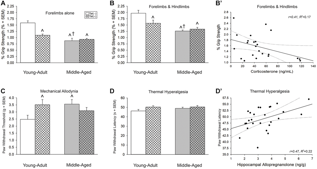 Older age and Tat expression interacted to influence the threshold for paw withdrawal in response to a mechanical stimulus [F(1,37) = 5.87, p < 0.05; Figure 6C]. Unexpectedly, middle-aged Tat(−) and young adult Tat(+) mice exhibited a greater mechanical threshold than did young adult Tat(−) controls (p = 0.02–0.03; Figure 6C, see ^). No differences were observed in thermal hyperalgesia among middle-aged or Tat-exposed mice (Figure 6D); however, hippocampal alloP was positively correlated with the latency to paw withdrawal from a thermal stimulus (Figure 6D’; Table 2).
