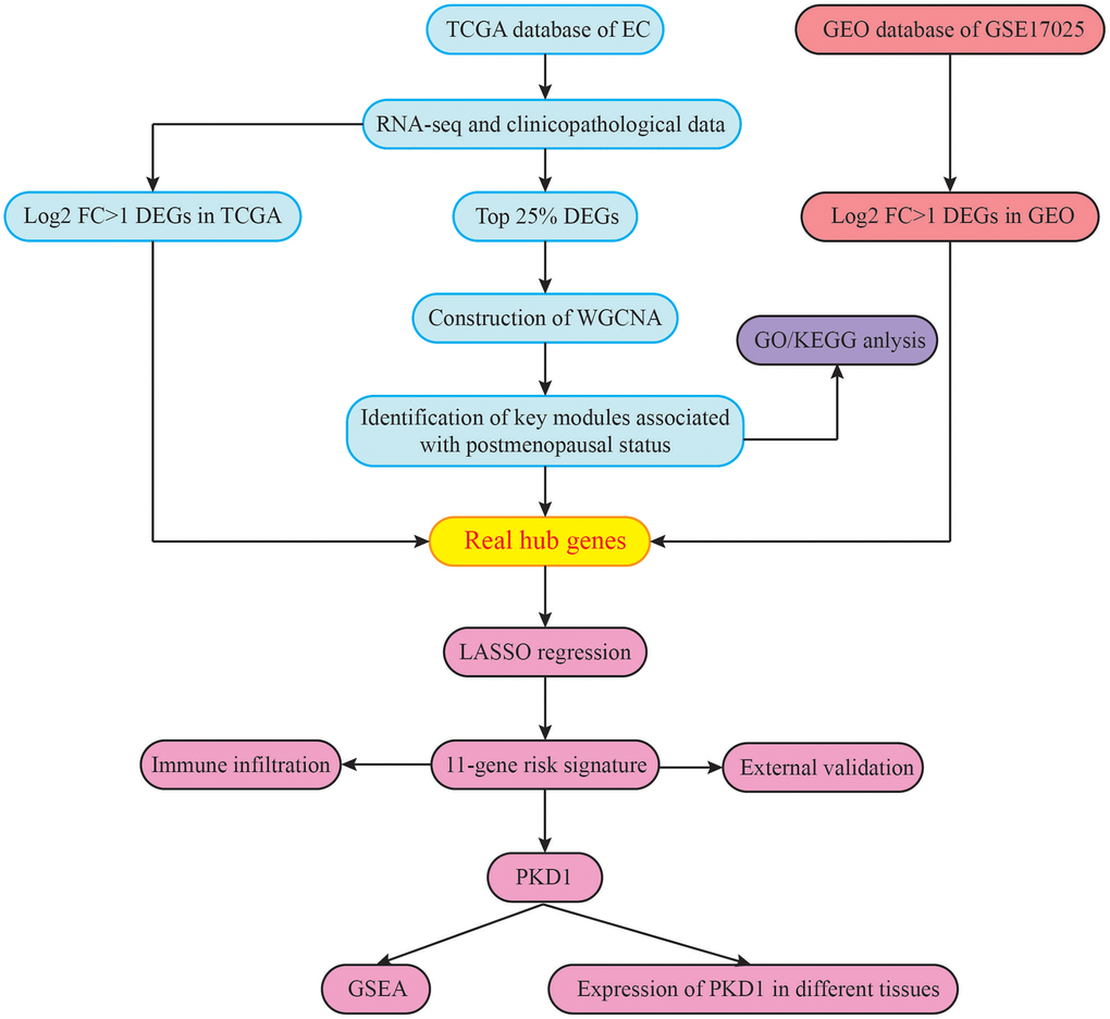 In conclusion, we performed a WGCNA approach integrating TCGA and GEO databases, and constructed a gene co-expression network to reveal a postmenopausal specific module and potential molecular mechanism underlying the tumorigenesis for EC. Furthermore, an 11-gene signature is constructed and validated. Finally, PKD1 was identified as potential biomarker that played a key role in the progression of EC with postmenopausal status.