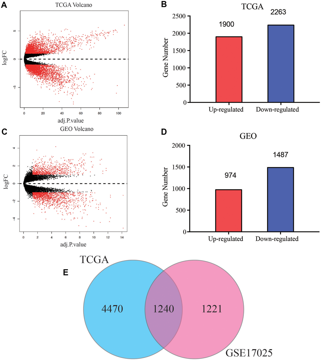 A brief study design was shown in Figure 1. The DEGs in both of the GEO and TCGA datasets were analyzed respectively using p < 0.05 and |log2FC| >1 as the cutoff criteria. The volcano maps of the DEGs in the two groups were constructed using the R package. Based on the screening guidelines, 4163 DEGs were acquired, consisting of 1900 up-regulated genes and 2263 down-regulated genes from EC tissues compared with normal endometrial tissues in TCGA dataset (Figure 2A, 2B). What’s more, we found a total of 2461 DEGs in the normal endometrial tissue in GSE17025, including 1487 downregulated and 974 upregulated genes (Figure 2C, 2D). In total, 1240 common genes are acquired by Venn diagram (Figure 2E).