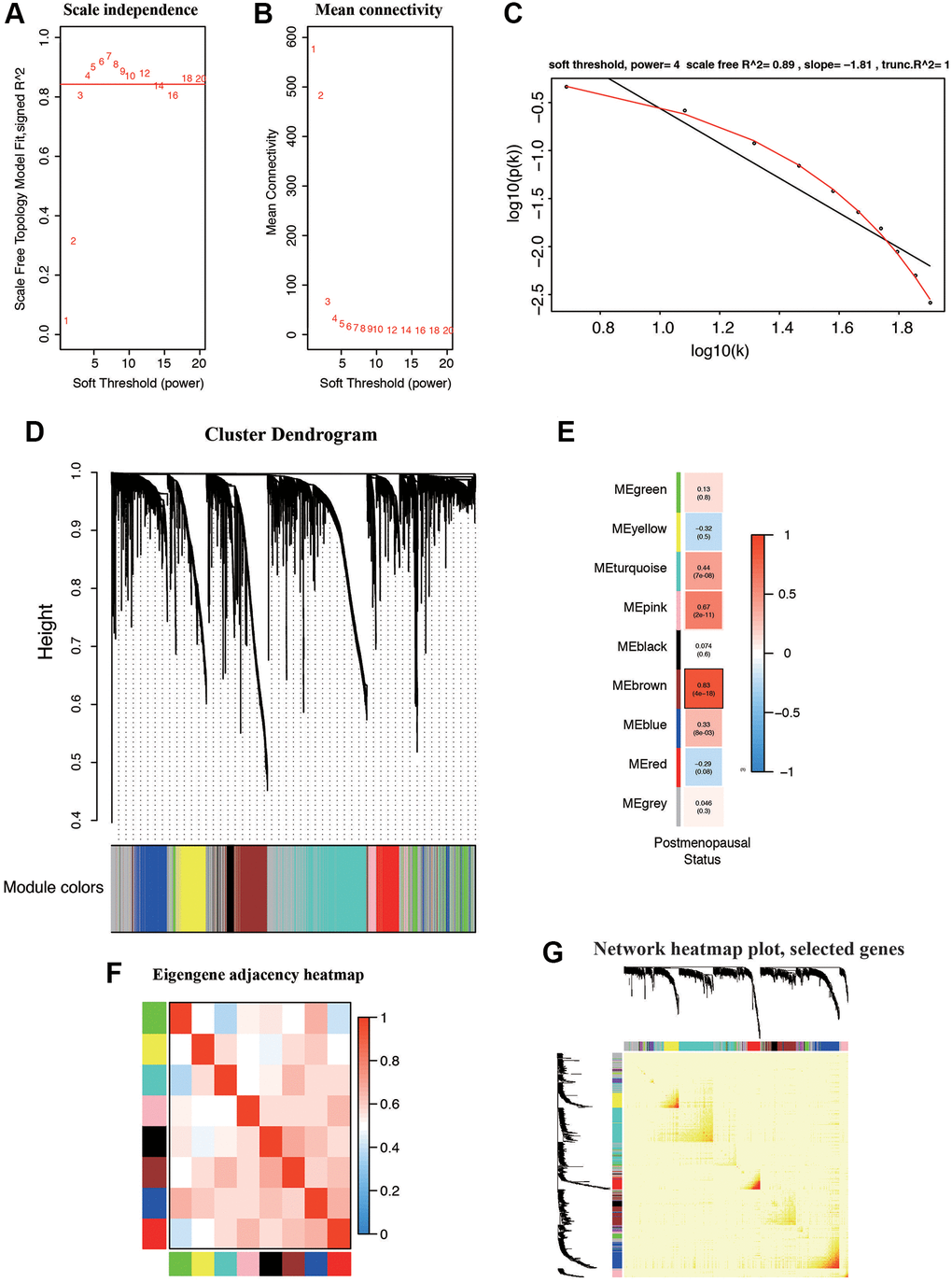 We constructed co-expression network by TCGA dataset including 545 EC samples associated with whole clinical information. When constructing co-expression network with “WGCNA” software package, the expression value of the first 25% DEG is included. In our study, β = 4 (scale free R2 = 0.89) was selected as the soft-thresholding power to ensure a scale-free network (Figure 3A–3C). All selected genes were classified using the dissimilarity measure based on topological overlap matrix (TOM), which is based on the dynamic tree cutting algorithm and divides the tree into eight modules marked with different colors (Figure 3D). We identified the relationship between each module and the EC clinical information, with a particular emphasis on postmenopausal status (Figure 3E). Pearson’s correlation coefficient was used to assess the association between the co-expression modules in this study. Modules with various gene clusters were labeled in the topological overlap heatmap using different colors, with blue indicating a negative relationship and red indicating a positive relationship (Figure 3F). Then 1000 genes were randomly selected for the heatmap. Results of the clustering analysis indicated that the hierarchical clustering of the module eigengenes was representative of the modules. The dendrogram branches were clustered according to the eigengene relationships (Figure 3G).