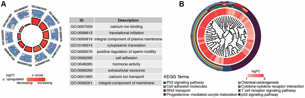 GO and KEGG enrichment analysis were used to explore the function and pathways of the hub genes. The brown module, which consisted of 471 genes, was mainly associated with the following subclasses of GO classification (Figure 4A): calcium ion binding, translational initiation, integral component of plasma membrane, and cell adhesion. KEGG pathway analysis showed that top enriched terms were P53 signaling pathway, cell adhesion molecules, T cell receptor signaling pathway, and chemical carcinogenesis (Figure 4B). These suggested that brown module genes were closely related to the calcium channel and cell adhesion.