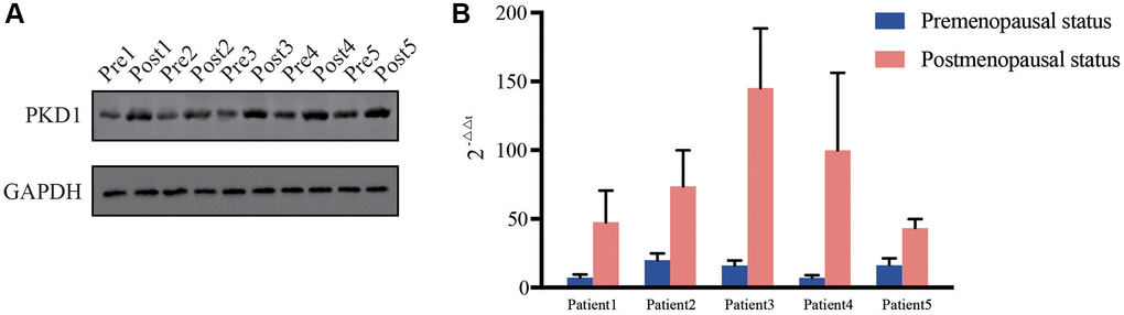 We further validated the expression of PKD1 in different clinicopathological characteristics of EC patients in TCGA database. The results indicated that PKD1 was highly expressed in cancer tissue, grade 3, positive lymph node metastasis, positive peritoneal cytology, and recurrence groups (Figure 6A–6E). Patients were divided into two cohorts according to median value of PKD1. The results indicated that the expression of PKD1 was significantly associated with patient prognosis (Figure 6F). The analysis showed that PKD1 was statistically different in worse outcomes of EC patients. GSEA results showed that high expression of PKD1 was enriched in apoptosis, and low expression of PKD1 was enriched in B cell receptor signaling pathway, endometrial cancer, mTOR signaling pathway, and VEGF signaling pathway (Supplementary Figure 2). The immune infiltration was significant diverse in different expression of PKD1 (Supplementary Figure 3). To further explore the expression of PKD1 in different menopause status, we performed the qPCR and western blot (WB) validation in clinical specimens following the steps described above. As shown in Figure 7A, 7B, the expression levels of PKD1 in postmenopausal patients was more than that in the premenopausal patients in EC group. These results indicated that PKD1 may play a pivotal role in EC especially in postmenopausal women.