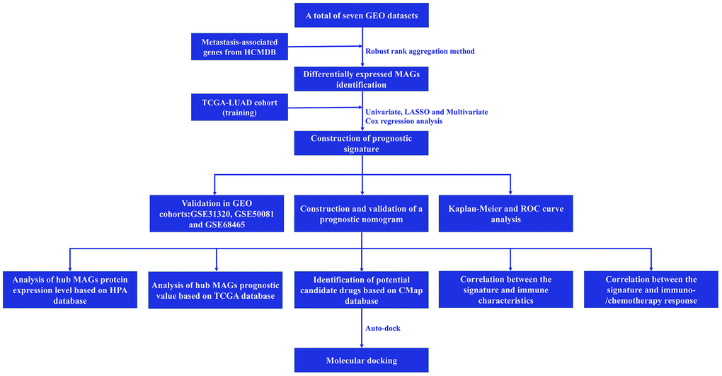 In this study, the differential mRNA expression data of LUAD from the HCMDB and GEO databases were analyzed to identify key genes. The integrated bioinformatics analysis by investigating the functions and pathways of the gene was used to further investigated their potentiality of being biomarkers in LUAD. A metastasis-associated prognostic signature based on six MAGs was constructed by Lasso and multiple Cox regression analyses. The prognostic value of the genes was evaluated using the ROC curve (Receiver Operating Characteristic Curve) and survival analysis. The reliability and applicability of the signature were further validated in the GSE31210, GSE50081 and GSE68465 cohort. Besides, correlation between the risk score and clinicopathological features, immune microenvironment characteristics, immunotherapy sensitivity, chemotherapy sensitivity and candidate drugs targeting the risk signature were analyzed in LUAD patients. In vitro experiment was conducted to confirm the mRNA and protein expression 6 MAGs in LUAD cell lines. Effect of candidate drug staurosporine on cell metastasis was conducted by migration experiment.