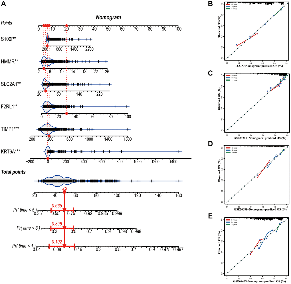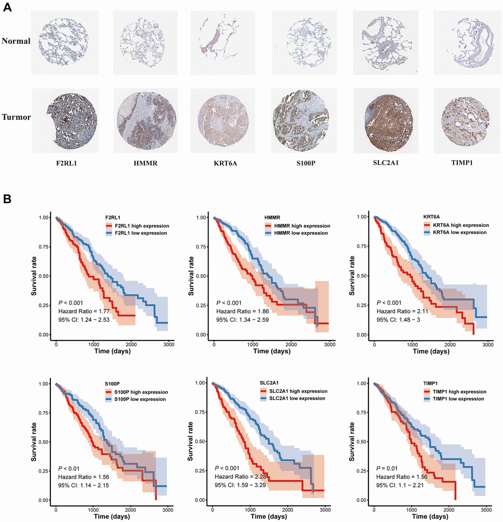 A nomogram based on metastasis-associated prognostic signature was constructed to provide clinicians a quantitative method, which could individually predict 1-, 3- and 5-year OS of each LUAD patients (Figure 9A). The calibration curve of the nomogram demonstrated good consistency with the predictions for 1-, 3- and 5-year OS in four cohorts (Figure 9B–9E). In addition, results from the HPA database showed that protein expression of F2RL1, HMMR, KRT6A, S100P, and SLC2A1 were significantly increased in LUAD tissues (Figure 10A). The prognostic value of 6 genes was analyzed using TCGA-LUAD dataset, the results illustrated that high expression of these genes suggested a worse prognosis for patients (Figure 10B).