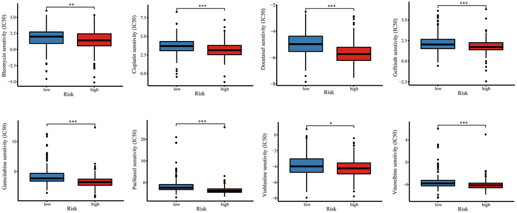 To evaluate the prognostic signature in the clinic for LUAD patient treatment, we calculated the half maximal inhibitory concentration (IC50) of common administrating chemotherapeutic drugs. The IC50 values of drugs in cancer cell lines were downloaded from the Genomics of Drug Sensitivity in Cancer (GDSC) database [55]. According to the GDSC database, the chemotherapy response for Bleomycin, Cisplatin, Docetaxel, Gefitinib, Gemcitabine, Paclitaxel, Vinblastine, and Vinorelbine of each LUAD patient was implemented using R package pRRophetic [55].