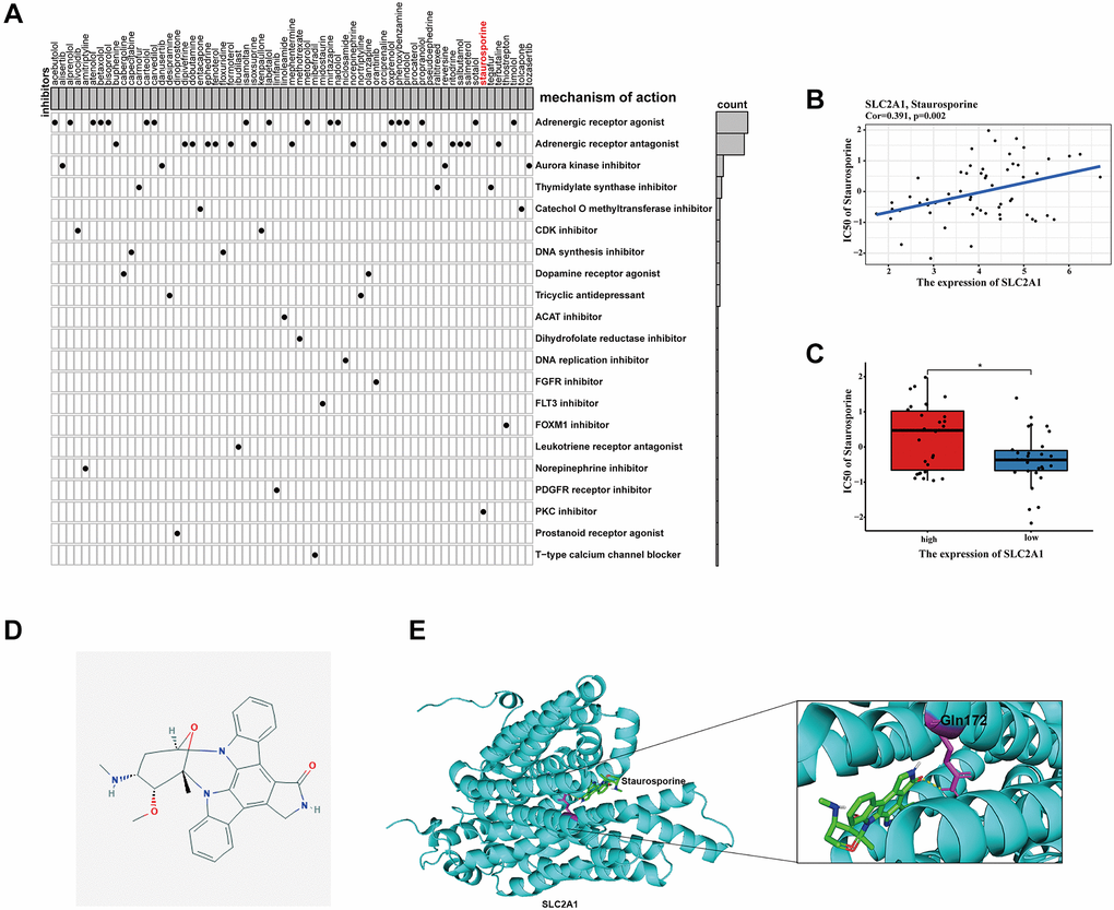 To present potential candidate drugs, the CMap database was conducted to predict small molecule drugs on the base of the prognostic MAGs as previously described [9]. The correlation between hub MAGs expression and drug response was predicted by CellMiner database (https://discover.nci.nih.gov/cellminer/) [56]. The structure of staurosporine and SLC2A1 were acquired from PubChem Compound (https://www.ncbi.nlm.nih.gov/pccompound, PubChem CID: 44259) and AlphaFold Protein Structure Database (https://www.alphafold.ebi.ac.uk/entry/P11166), respectively [57]. The molecular docking was conducted via AutoDockTools 1.5.6, Vina and Genetic Algorithm, and the docking result was displayed by PyMoL.
