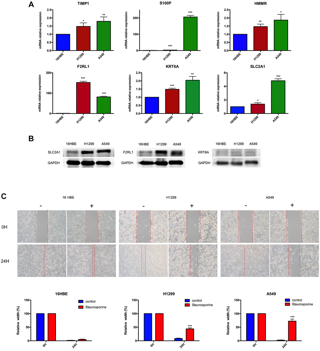 In order to further validate 6 MAGs expression in the lab, qRT-PCR in normal respiratory epithelial cells (16HBE) and 2 lung adenocarcinoma cell lines (A549 and H1299) were carried out. As illustrated in Figure 14A, mRNA expression levels of TIMP1, S100P, HMMR, F2RL1, KRT6A, and SLC2A1 were significantly increased in lung adenocarcinoma cell lines compared to16HBE, which were consistent with our bioinformatics analysis results. Besides, the protein expression of SLC2A1, F2RL1 and KRT6A were also significantly increased in A549 and H1299 compare to 16HBE (Figure 14B). Furthermore, we validated effect of SLC2A1 predicted drug (staurosporine) on cell metastasis by migration experiment (Figure 14C), as shown that staurosporine could significantly inhibit A549 and H1299 migration.