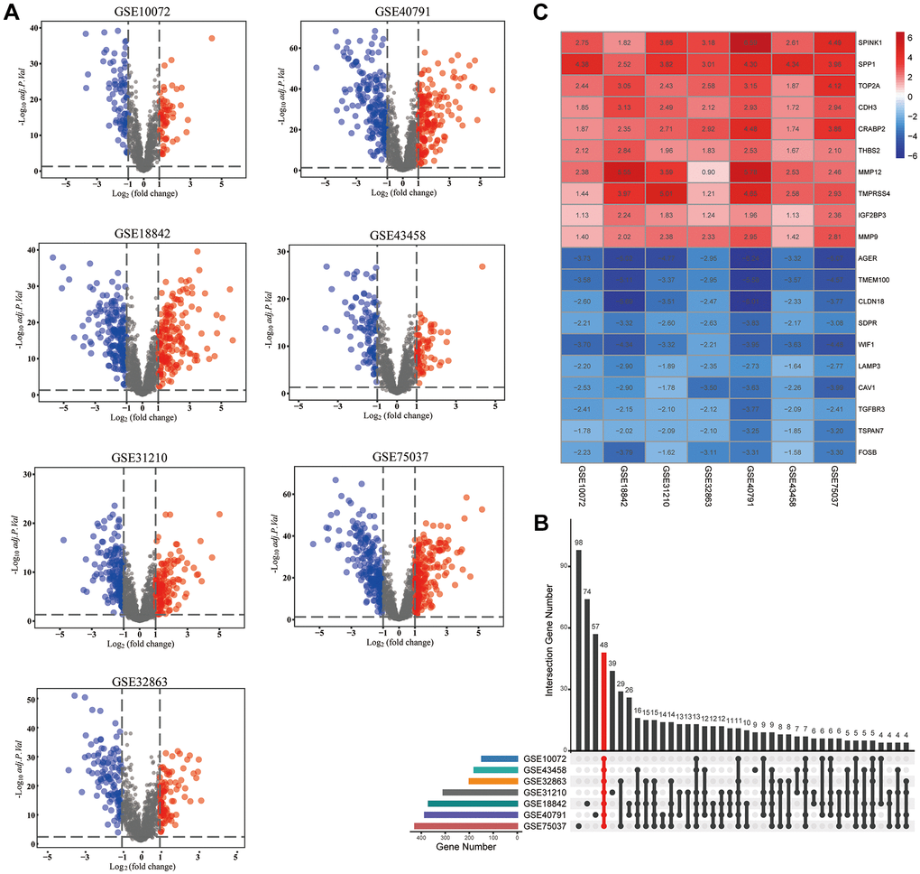 A simplified protocol flow chart of this study was presented in Figure 1. 1938 MAGs were obtained from the HCMDB database. Seven GEO datasets were used to screen differentially expressed MAGs (Table 1). Based on the cutoff criteria as before, 147 differentially expressed MAGs (84 downregulated and 63 upregulated MAGs) were identified in GSE10072 dataset, 369 differentially expressed MAGs (193 downregulated and 176 upregulated MAGs) were identified in GSE18842 dataset, 308 differentially expressed MAGs (172 downregulated and 136 upregulated MAGs) were identified in GSE31210 dataset, 199 differentially expressed MAGs (113 downregulated and 86 upregulated MAGs) were identified in GSE32863 dataset, 199 differentially expressed MAGs (113 downregulated and 86 upregulated MAGs) were identified in GSE40791 dataset, 179 differentially expressed MAGs (109 downregulated and 70 upregulated MAGs) were identified in GSE43458 dataset, 426 differentially expressed MAGs (220 downregulated and 206 upregulated MAGs) were identified in GSE75037 dataset (Figure 2A). Due to only 48 common MAGs were found between the seven GEO datasets (Figure 2B), RRA method was used to identify MAGs and finally 192 significantly robust MAGs were determined, including 109 downregulated and 83 upregulated MAGs (Figure 2C).
