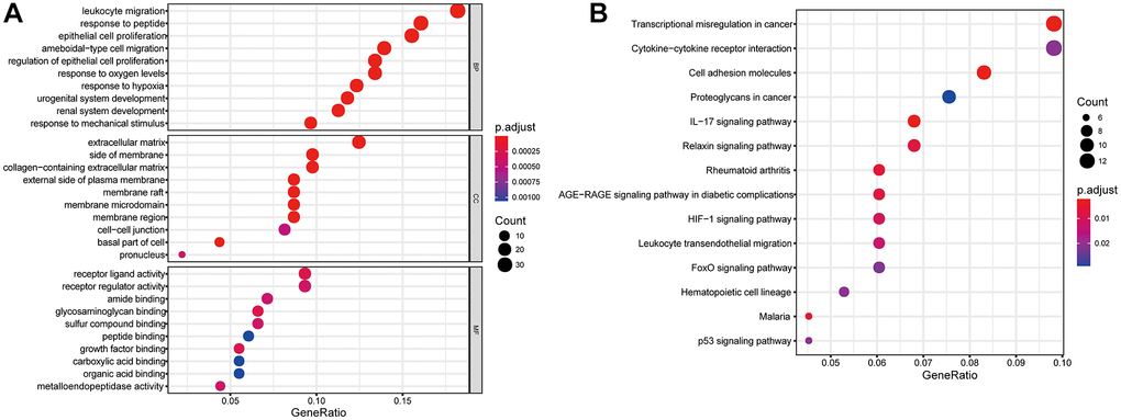 GO analysis were carried out to investigate the potential biological function of the 192 MAGs and KEGG pathway enrichment analyses were carried out to found the promising signaling pathways. We found that 192 MAGs were mainly enriched in leukocyte migration, response to peptide, epithelial cell proliferation, extracellular matrix, receptor regulator activity and et al. (Figure 3A). Also, these MAGs were mainly enriched in transcriptional misregulation in cancer, proteoglycans in cancer, IL-17 signaling pathway and et al. (Figure 3B).