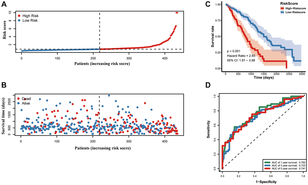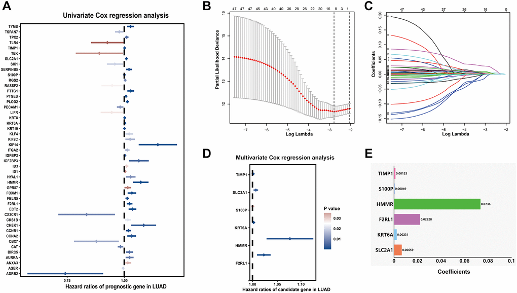 Samples from TCGA-LUAD were classified as the training cohort. Univariate cox regression analysis was conducted on 192 differentially expressed MAGs. A total of 47 genes associated with prognosis were identified with adjusted P value < 0.05 (Figure 4A). After Lasso and multiple Cox regression analyses, a metastasis-associated prognostic signature based on six MAGs (TIMP1, S100P, HMMR, F2RL1, KRT6A, and SLC2A1) was constructed (Figure 4B–4D). The coefficients of these genes were displayed in Figure 4E, and the signature risk score was defined as the sum of the expression levels of the coefficients-weighted genes. LUAD patients were stratified into the high- and low-risk groups by the mean risk score. The risk score, survival status and survival time of patients were respectively shown in Figure 5A–5C. Low-risk group patients have significantly better OS than high-risk group, indicating that the risk score had a prognostic value (Figure 5C). The AUCs for 1-, 3-, 5-year OS rate were 0.762, 0.723, and 0.741, respectively (Figure 5D, P < 0.001).