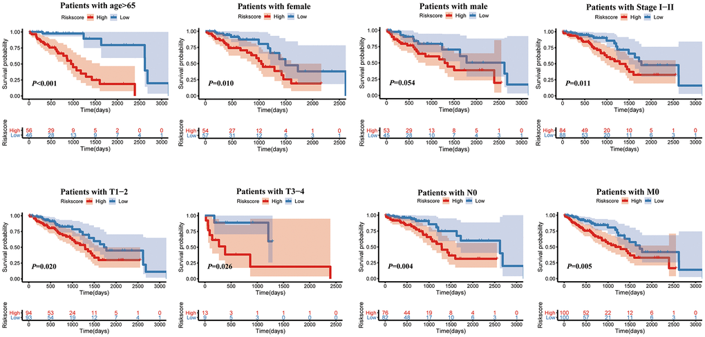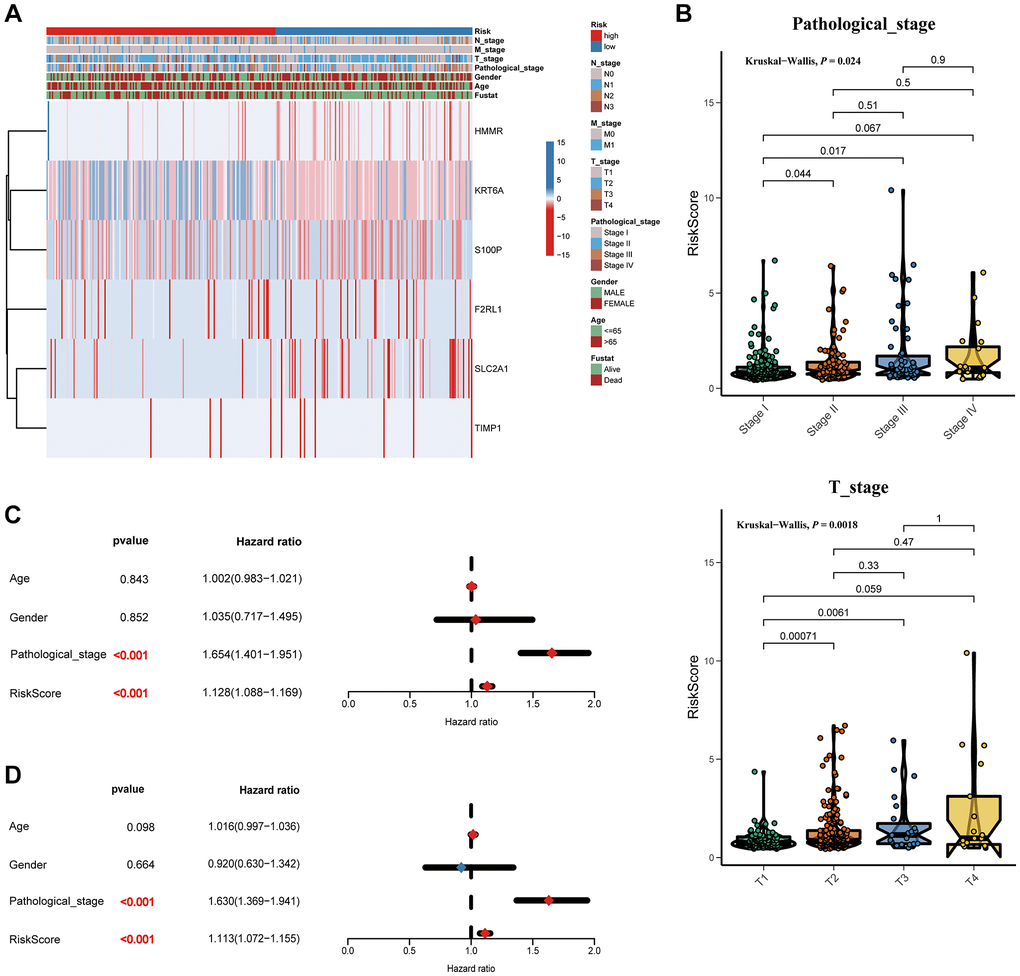 Furthermore, as shown in the heatmap, the expression levels of TIMP1, S100P, HMMR, F2RL1, KRT6A, and SLC2A1 were increased in high risk score group, (Figure 6A). The higher pathological stage was concomitant with a higher risk score. Moreover, patients with higher risk factor scores had higher T-stages (Figure 6B). Univariate (Figure 6D) and multivariate (Figure 6C) Cox analyses showed that both the risk score and pathological stage were independent risk factors. The prognostic value of the signature was analyzed via stratification analysis. We also combined the signature model with clinical risk factors (including age, sex, clinical stage, and TNM stage) to better exploit its prognostic predictive efficiency in lung adenocarcinoma patients, and the results showed that when patients were exposed to the same clinical risk factors (such as age >65, Female, Stage I–II, T-stage (T1/2, or T3/4), N-stage (N0), and M-stage (M0)), the high risk group had a significantly worse prognosis (Figure 7).