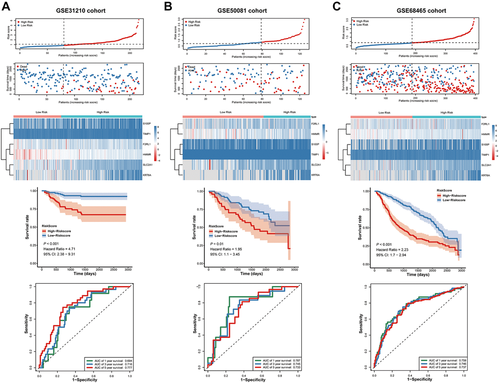 Next, we used ROC Curves to test the accurately of the prognostic signature for predicting patients' 1-, 3-, and 5-year OS. The analysis results showed that AUC values in all three independent cohorts have statistically significant (Figure 8A–8C). These results suggested that the signature was capable of general application and had a robust performance in predicting LUAD patients’ prognosis.