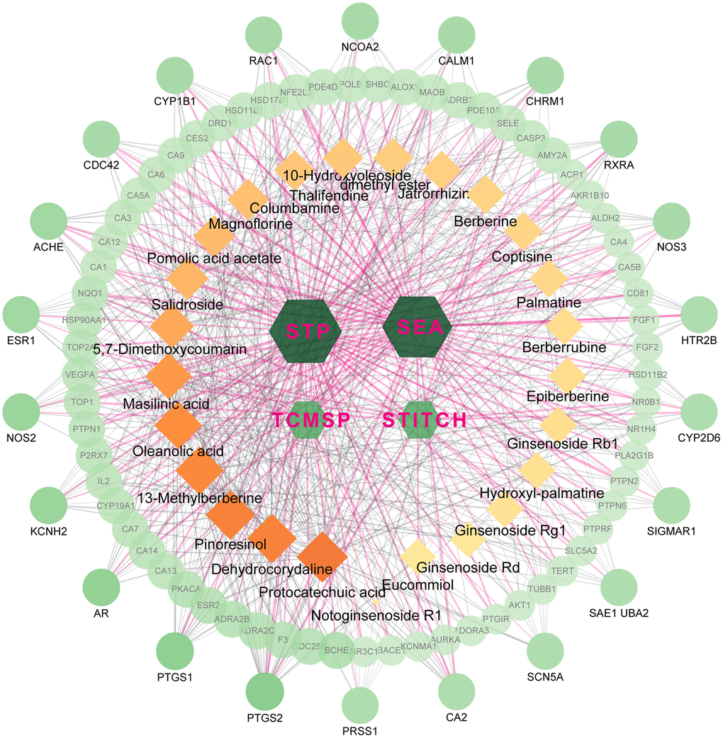 The active ingredients after oral administration of FTZ were identified by UPLC/Q–TOF–MS. Twenty-seven compounds originated from FTZ were confirmed and one of which could not be recognized. Thus, the 26 remaining compounds were collected for further analysis, including 10-Hydroxyoleoside, dimethyl ester, Salidroside, Hydroxylpalmatine, Protocatechuic acid, Magnoflorine, Eucommiol, Thalifendine, Columbamine, Epiberberine, Coptisine, Jatrorrhizine, Notoginsenoside R1, Berberrubine, Palmatine, Berberine, Ginsenoside Rg1, De-hydrocorydaline, 13-Methylberberine, 5,7-Dimethoxycoumarin, Ginsenoside F1, Ginsenoside Rb1, Ginsenoside Rd, Pinoresinol, Pomolic acid acetate, Oleanolic acid, and Maslinic acid. Through target fishing, 593 predicted targets were obtained using TCMSP, SEA, STITCH, STP databases. Among the 26 ingredients, Protocatechuic acid has the highest number of targets (142 targets), while no target was identified for Ginsenoside F1. Therefore, the databases-compounds-targets network of FTZ consists of 623 nodes (4 in databases, 26 in bioactive ingredients, 593 in potential targets) and 1870 edges. For better clarity and concise presentation, only target nodes whose degree is greater than 5 were shown (Figure 1). Detailed information can be found in the Supplementary Data.