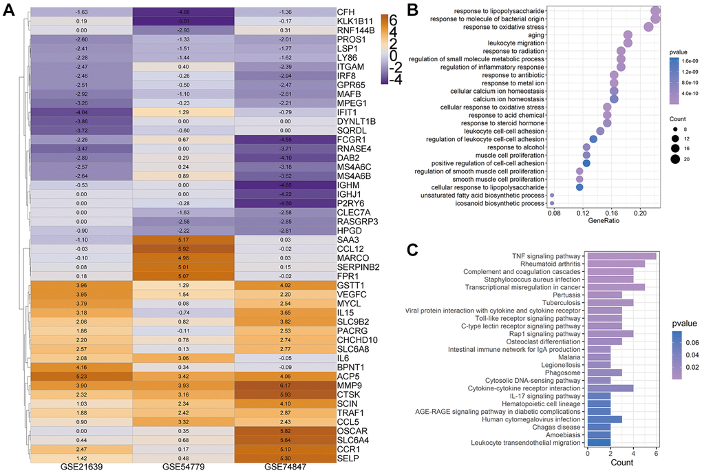 To investigate the critical biological processes and pathways, we further used the Robust rank aggregation (RRA) method to fitter out solid genes which severed as DEGs in each array. 52 DEGs (|logfc| ≥ 1, P < 0.05) were identified, 25 of which were upregulated and 27 downregulated during osteoclastogenesis (Supplementary Table 1). A clustering diagram was constructed to display the top 50 RRA DEGs sorted by their absolute logfc values. The color depth changes according to their logfc values presented inside the cells (Figure 2A). Osteoclastic marker genes, such as Mmp9 and Acp5, are significantly increased among these three arrays, and these results proved that our analyses are accurate and reliable.