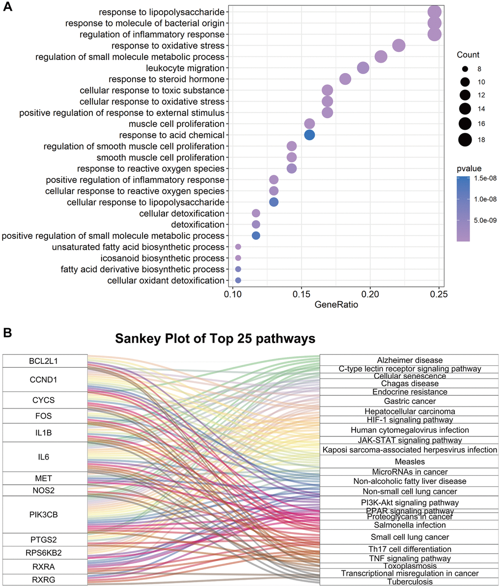 To further explore the potential mechanisms of FTZ in suppressing osteoclastogenesis, GOBP enrichment of these 77 targets was conducted through the clusterProfiler package, and then a total of 1300 BP terms were enriched. After sorting these terms in ascending order of P value and gene counts, the top 25 BP terms were displayed in Figure 4A. Among these top 25 BP terms, the regulation of inflammatory response (GO:0050727, 3rd and P < 0.0001) and the response to oxidative stress (GO:0006979, 4th and P < 0.0001) are all proven critical processes related to osteoclastogenesis. It is noteworthy that these BP terms have been found to be associated with osteoclastogenesis in the RRA analysis part (Figure 2B). Moreover, the terms, including the regulation osteoclast differentiation (GO:0030316, 771th and P < 0.01), myeloid cell homeostasis (GO:0002262, 589th and P < 0.01) and myeloid cell differentiation (GO:0030099, 770th and P < 0.01), were identified in the total BP enrichment.