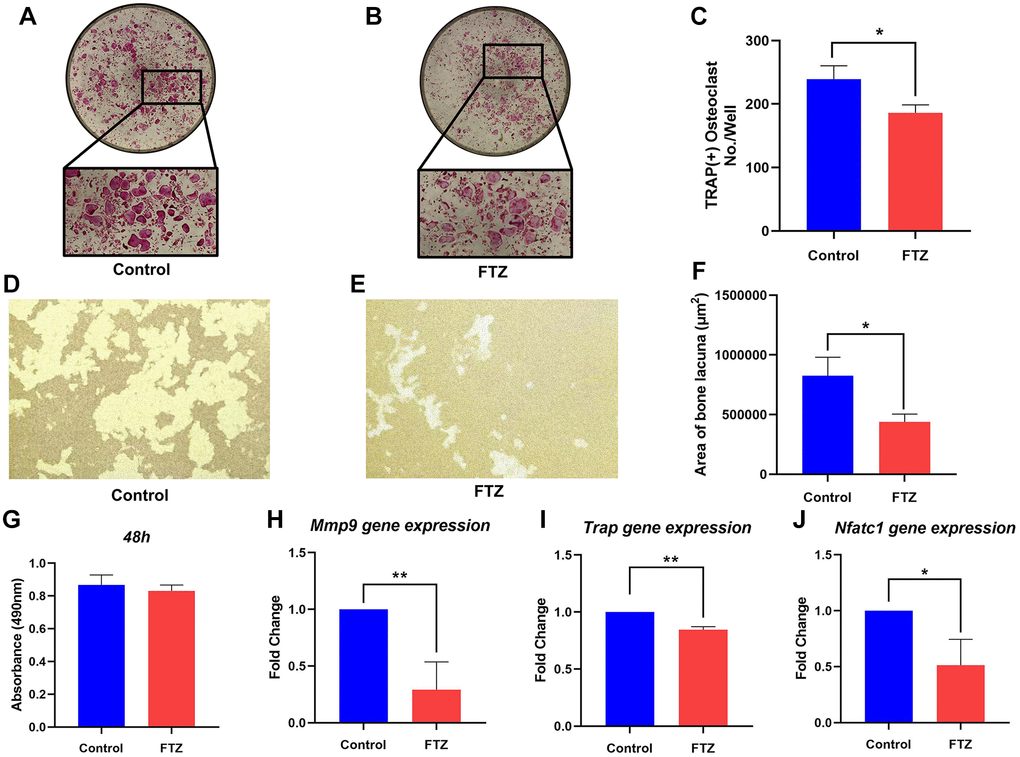 Resorption pit assay was conducted to observe the inhibition of FTZ to osteoclast-induced bone resorption under RANKL stimulation. Mature osteoclasts diverged from BMMs under RANKL and M-CSF induction had strong bone resorption capacity. Their bone-resorbing activity was significantly attenuated under the intervention of FTZ serum (Figure 7D–7F). RT-qPCR was further used to confirm the inhibitory effect of FTZ on osteoclastogenesis at the gene expression level. The expression levels of Mmp9, Trap, Nuclear factor of activated T-cells, cytoplasmic 1 (Nfatc1) were found to be remarkably reduced in the FTZ group (Figure 7G–7J).